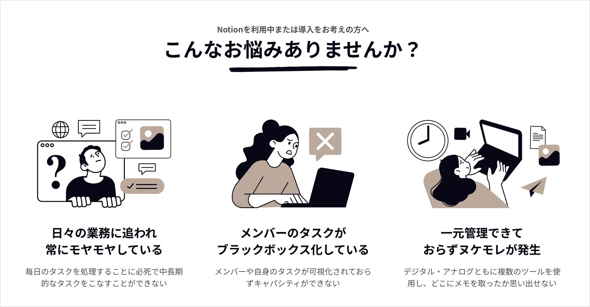 情報過多・働き方の多様化・プロジェクトの複雑化などにより、多くの企業や事業主の方が「タスク管理の効率化」に悩んでいます。これらの課題を認識し、Notionを活用した柔軟かつ効率的なタスク管理サービスを開発しました。