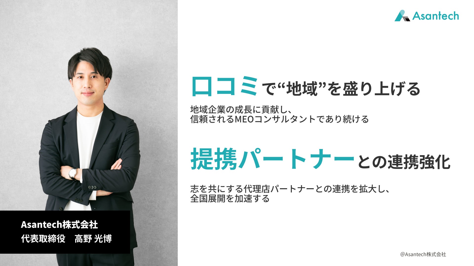 Asantech株式会社は今後、特に地域密着型ビジネスのGoogleマップ集客対策を支援するパートナー企業として、AIの最先端技術を駆使しながらさらにサービスの拡充を進めていく所存です。年内にローカルテック導入企業100社を目標に、邁進してまいります。