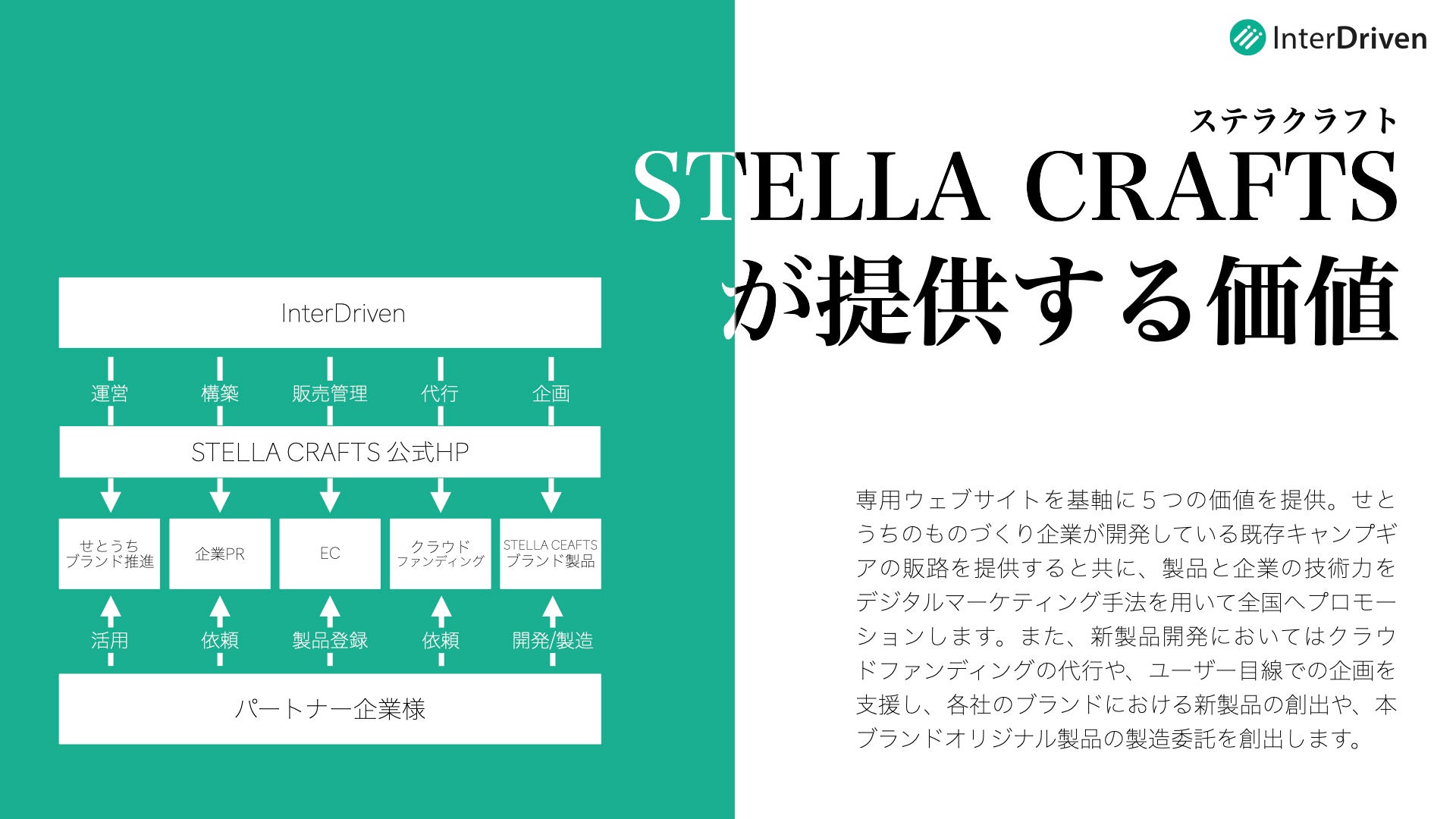 インタードリブン株式会社(本社:広島県福山市、代表取締役社長CEO:桑原 正光、以下「インタードリブン」)は瀬戸内地域のものづくり企業が手掛けるキャンプギアの総合ブランディングや新商品の企画開発をおこなうアウトドアの新ブランド「STELLA CRAFTS(ステラクラフト)」を立ち上げましたのでお知らせします。