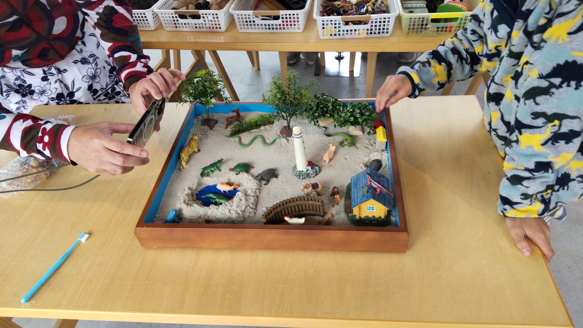 作品として自分の世界を自由に表現する「自由な箱庭」、仲間と楽しむゲーム「まねっこ」「無い無いどれだ」などを提案しています。