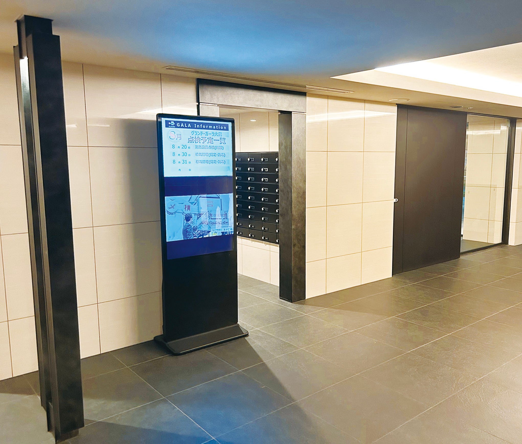 第一弾として、株式会社FJネクストホールディングス(本社:東京都新宿区、代表取締役社長:肥田恵輔(東証プライム:8935))の100%子会社で、主にGALAマンションシリーズを管理する、株式会社エフ・ジェー・コミュニティ(本社:東京都新宿区、代表取締役社長:肥田恵輔)と連携し、2024年8月から同マンションシリーズに順次サイネージを設置。9月から正式に広告配信をスタートします。