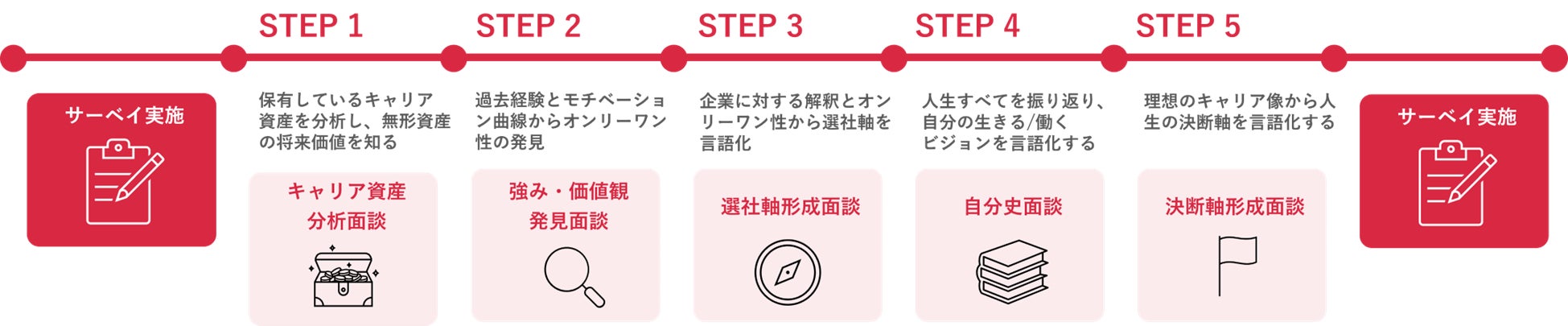 自己理解プログラムでは、定量的に自分の強み・弱みやモチベーションタイプを可視化できるサーベイ「BRIDGE-i」を活用しながら、当社のキャリアアドバイザーが1対1で全5回の面談を行い、主体的な意思決定に向けた判断軸の言語化をサポートします。