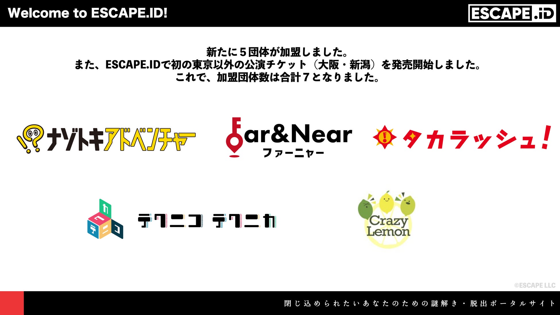 ESCAPE合同会社(所在地:東京都品川区、統括プロデューサー 佐々木 翼)の運営する謎解き・脱出ゲームの公演・イベントに特化したポータルサイト「ESCAPE.ID」に、このたび新たに5団体が加盟したことをお知らせいたします。また、初の地方公演として、大阪・新潟における謎解き公演のチケットを販売開始しました。