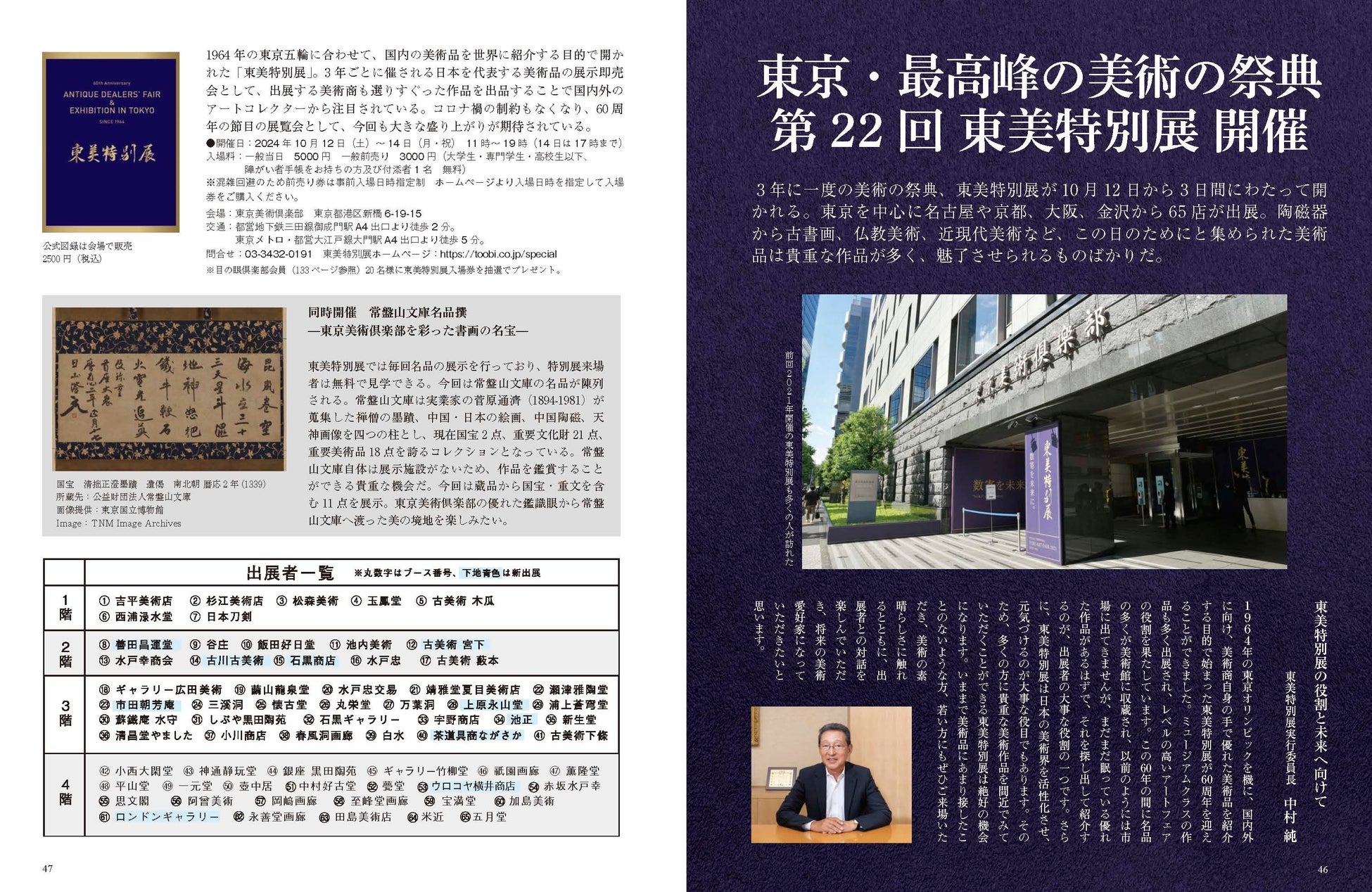その東京美術倶楽部が、3年に一度開催する美の祭典「第22回 東美特別展」が、10月12日(土)・13日(日)・14日(月祝)に本拠地である美術倶楽部で行われます。出展する美術商がこの特別展のために選りすぐりの美術品を出品するため、毎回国内外のアートコレクターが訪れる展示販売フェアとなっています。10月号では、東美特別展実行委員長の中村純さんにインタビューしているほか、出展者リストや初出展者の紹介記事を掲載し、特別展のミニガイド本として活用いただけます。