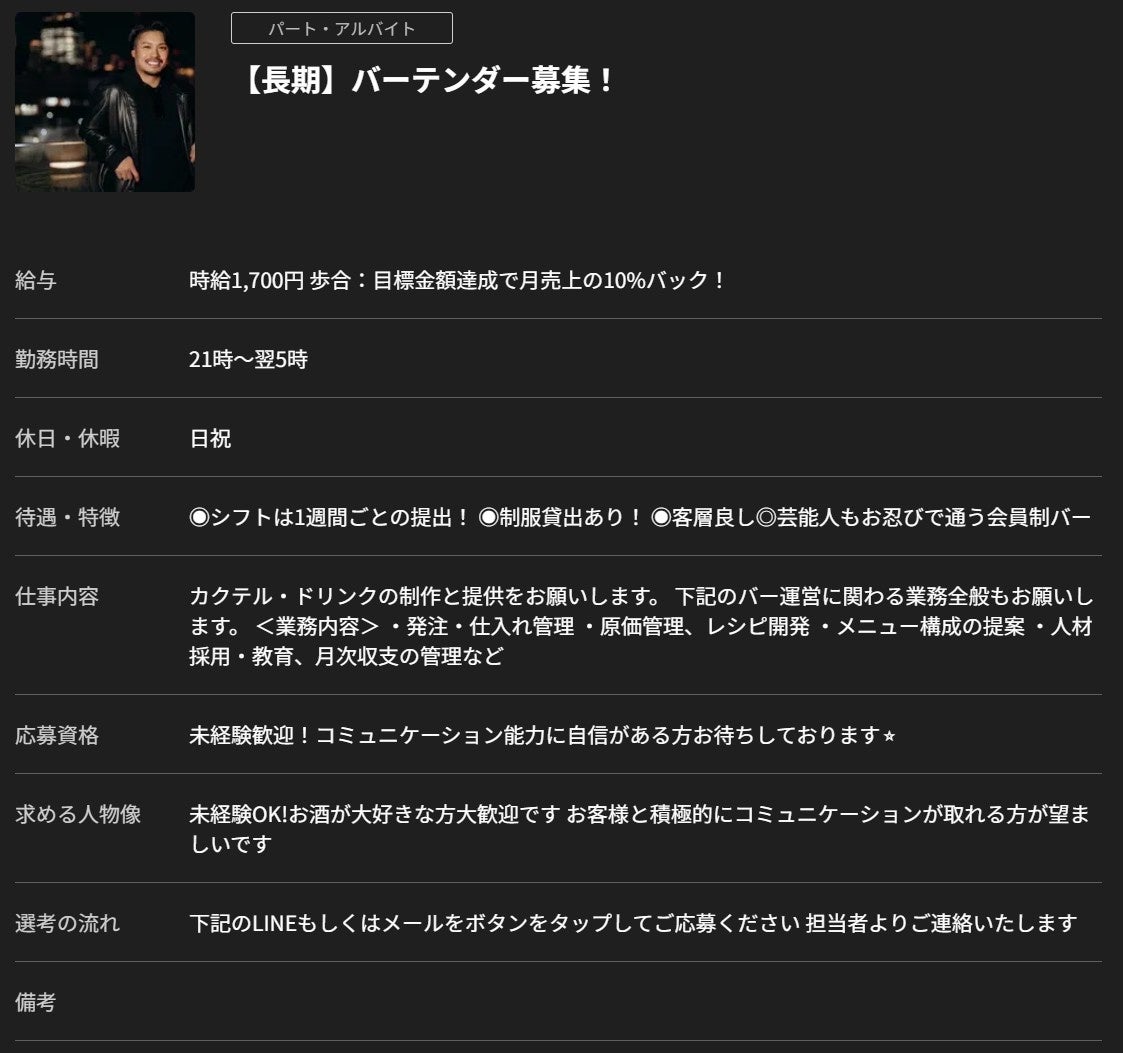 tipper nightは主にナイトワーク従事者のアフター利用を見据えたバーなどの飲食店集客をサポートする予約サービス。通常の店舗予約システムとは異なり、サービスのユーザーと加盟店舗間で現金化も可能なチップを互いに送り合うことができるという特徴があります。加盟店が増えていく中で多くの声が上がっていた“スタッフ不足”の課題に着目し、求人を募集できる機能を無料で提供を始めます。