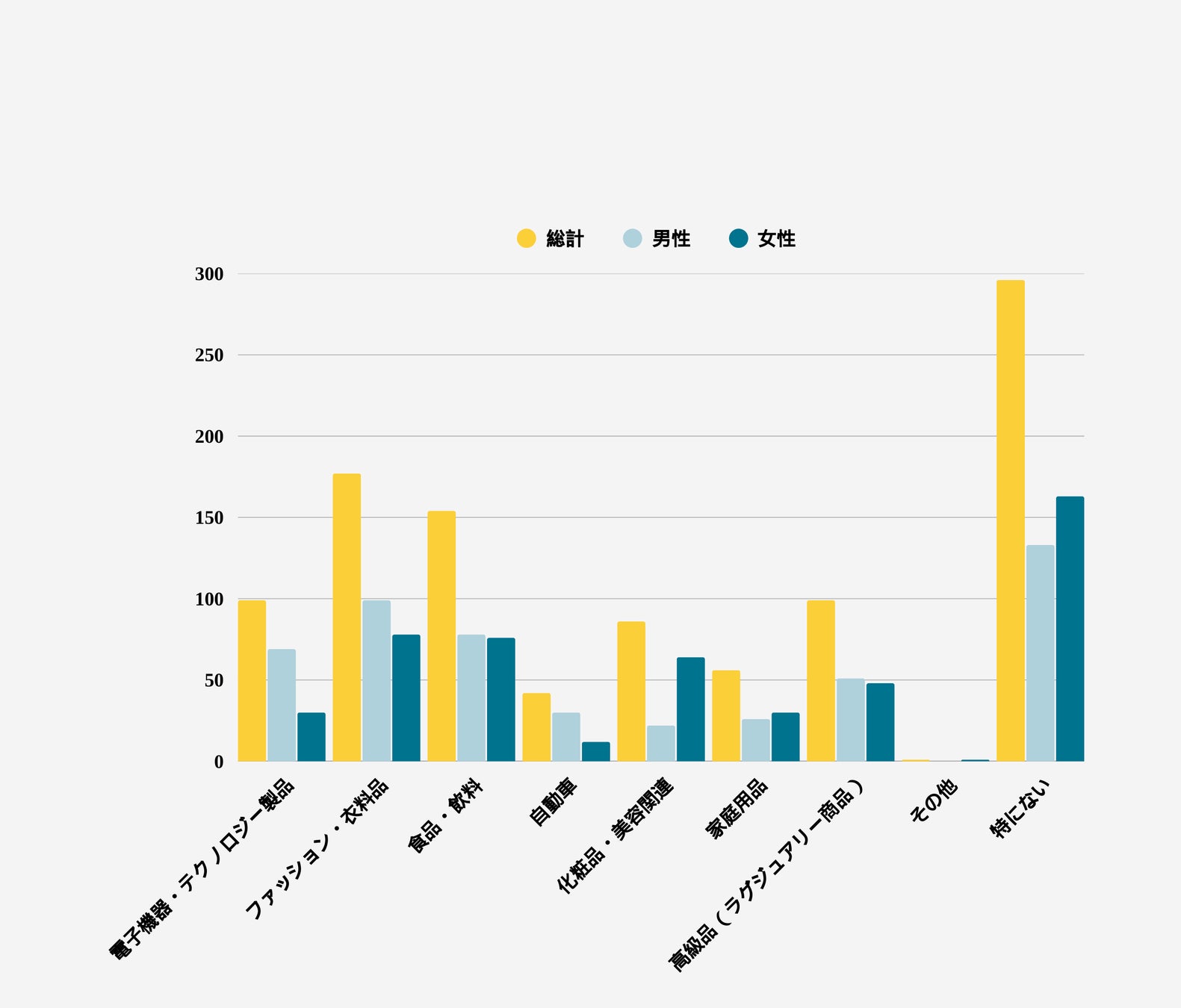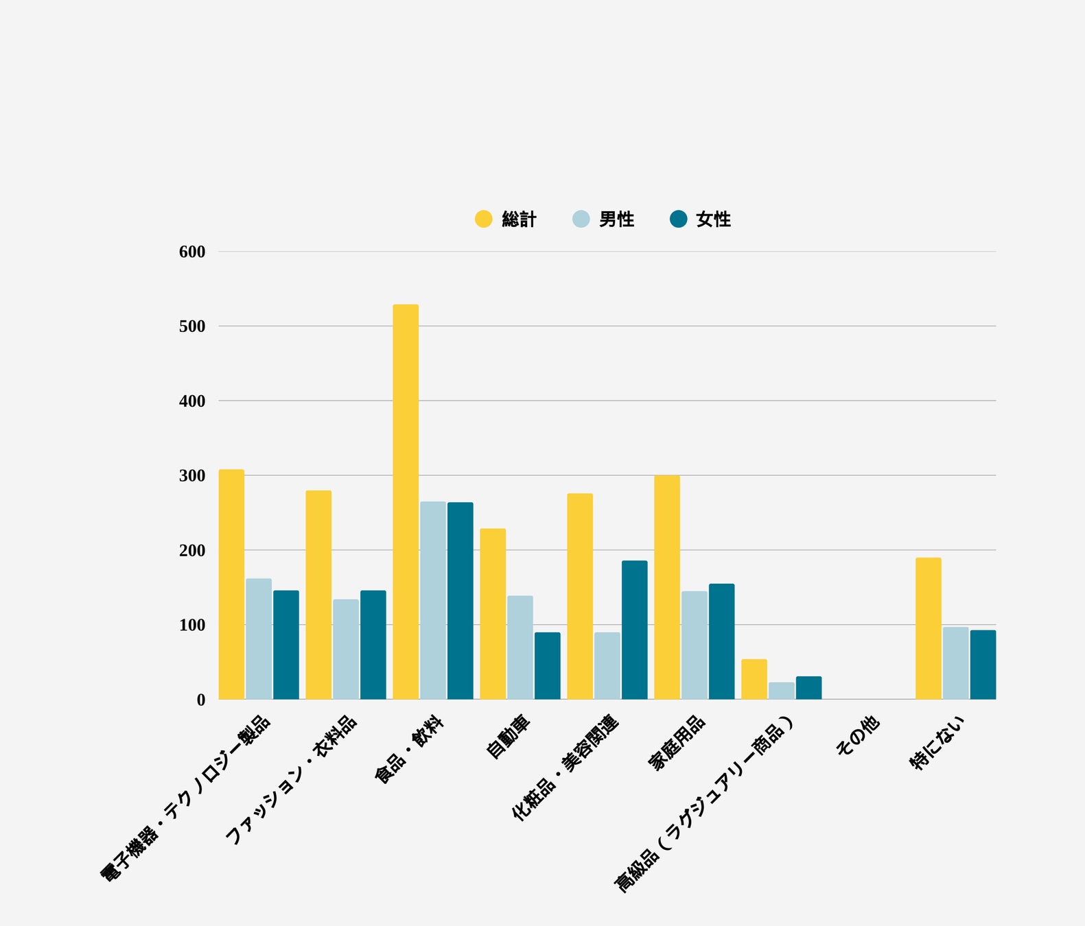 このデータは、男性が国内自動車を好む割合が高く(約33% 対 女性21%)、一方で女性は国内化粧品・美容関連を支持する割合が非常に高い(約44% 対 男性21%)ことを示しています。