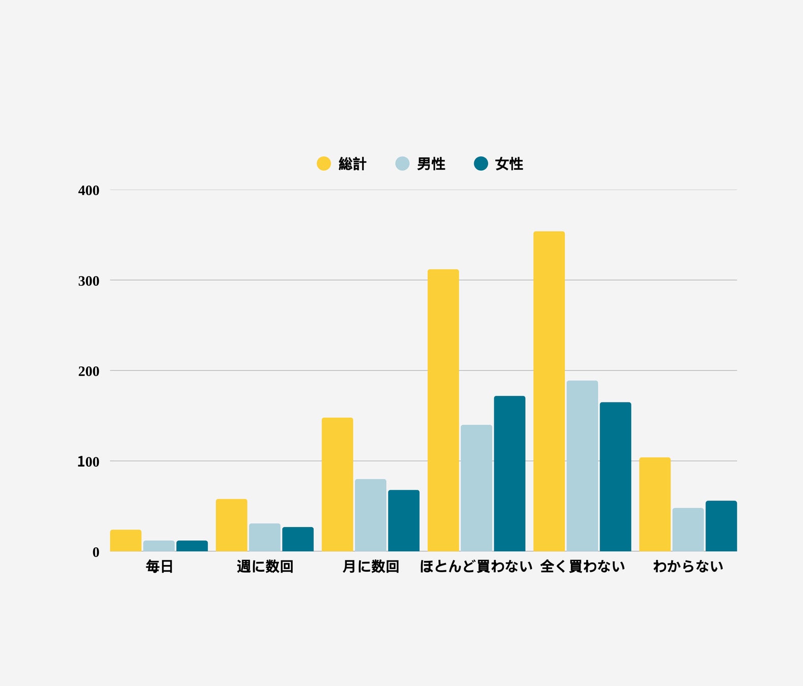 男女間では購入頻度に実質的な違いはなく、全カテゴリでほぼ同じ割合となっています。