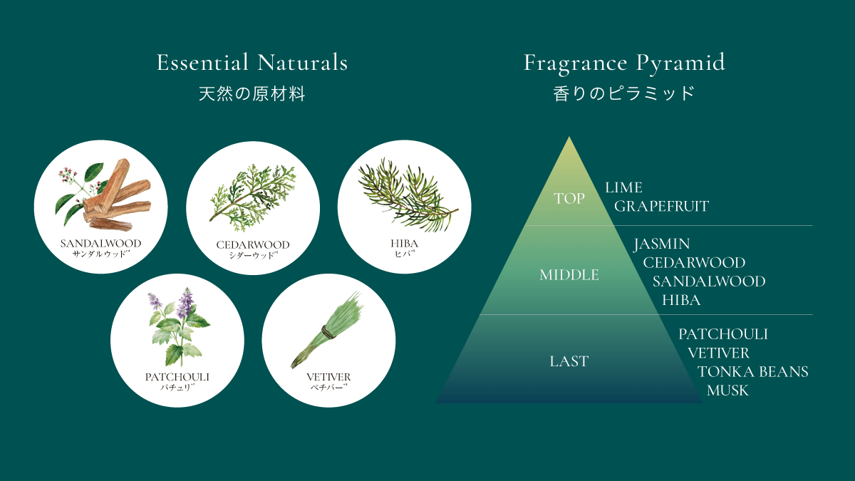 ゆったりと穏やかに、気持ち安らぐ。サンダルウッド(白檀)*3を中心に、ウッディな素材を配合し、奥行きのある優雅さを調香しました。