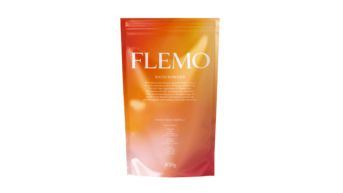ブランドのローンチと同時に登場するのは、バスパウダー「FLEMO BATH POWDER」。主成分に天然芒硝(ぼうしょう)*1を採用し、98.3%自然由来成分を配合した優しいバスパウダーです。まるで温泉に浸かっているかのような、体を包み込むやさしい温浴体験*を提供します。