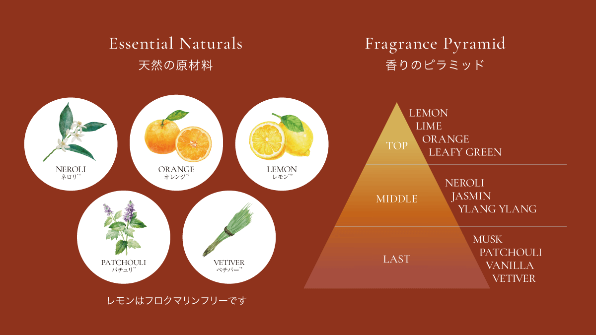ふんわりと晴れやかに、気持ち上向く。ネロリ*4を中心に、濃厚な花々の香りの中に、葉のスモーキーさを加えて深みのある華やかさを調香しました。