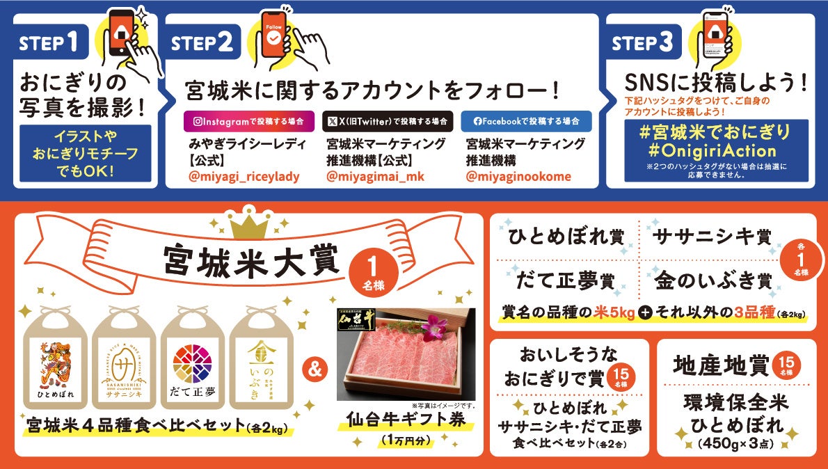 おにぎりの写真を指定のハッシュタグをつけて各種SNS(X、Instagram、Facebook)に投稿すると、抽選で総勢35名様に宮城米や仙台牛1万円分などを進呈。