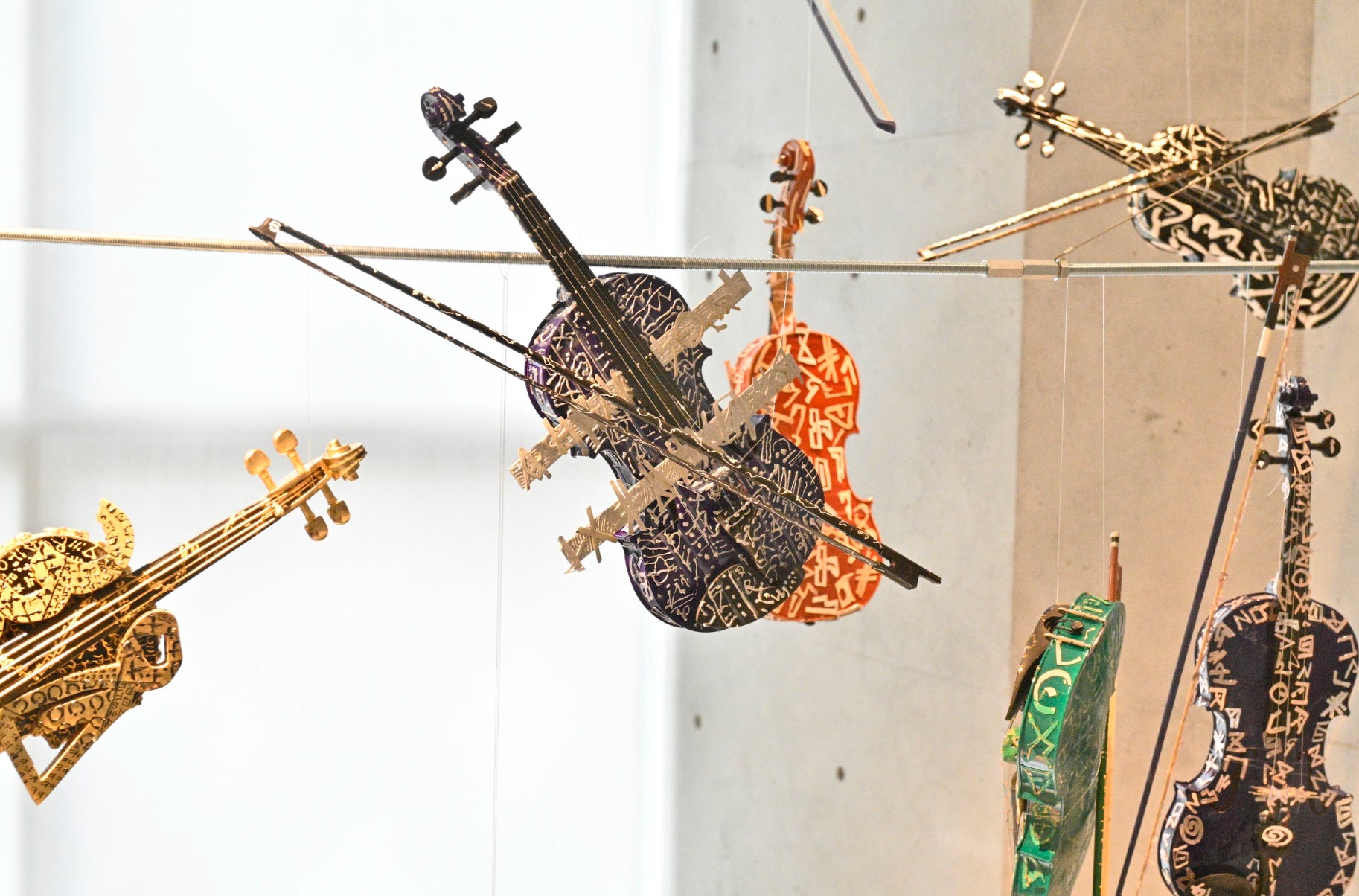 今回、向井氏は「建築は凍れる⾳楽である」とゲーテが好んで用いた表現に着想を得て、安藤忠雄建築研究所の展示空間と共鳴する新作のインスタレーションを制作。向井氏の視点からGUTAIの追憶に浸り、美術史における立ち位置を再考し、現代における価値と未来への展望を探求する。まるで「ヴァイオリンの記号パーティー」が催されているかのように、未知なるリズムが空間全体に響き渡ります。音楽と視覚芸術が交差するこの展示は、来場者の感覚を揺さぶる新しい体験を提供致します。
