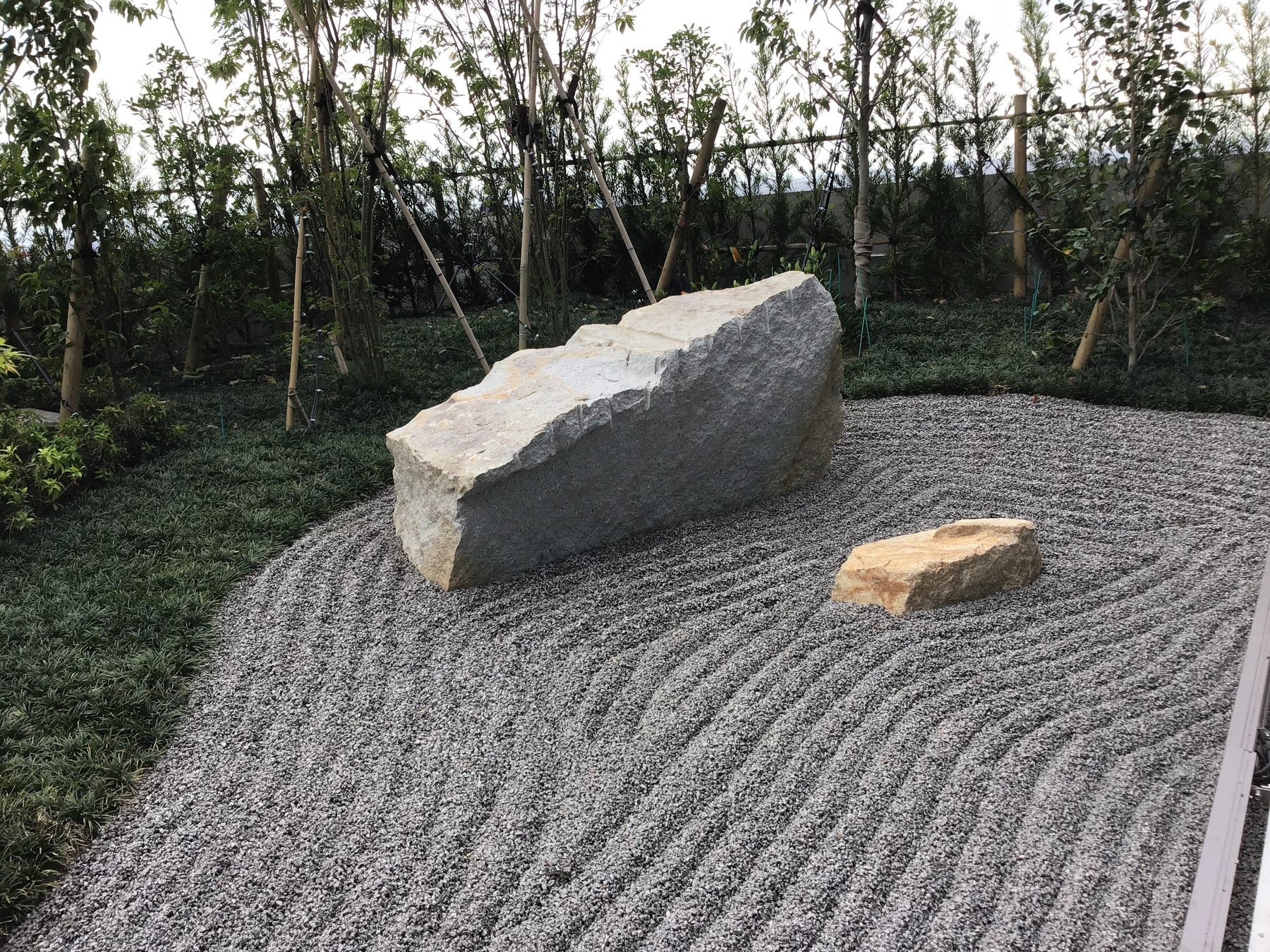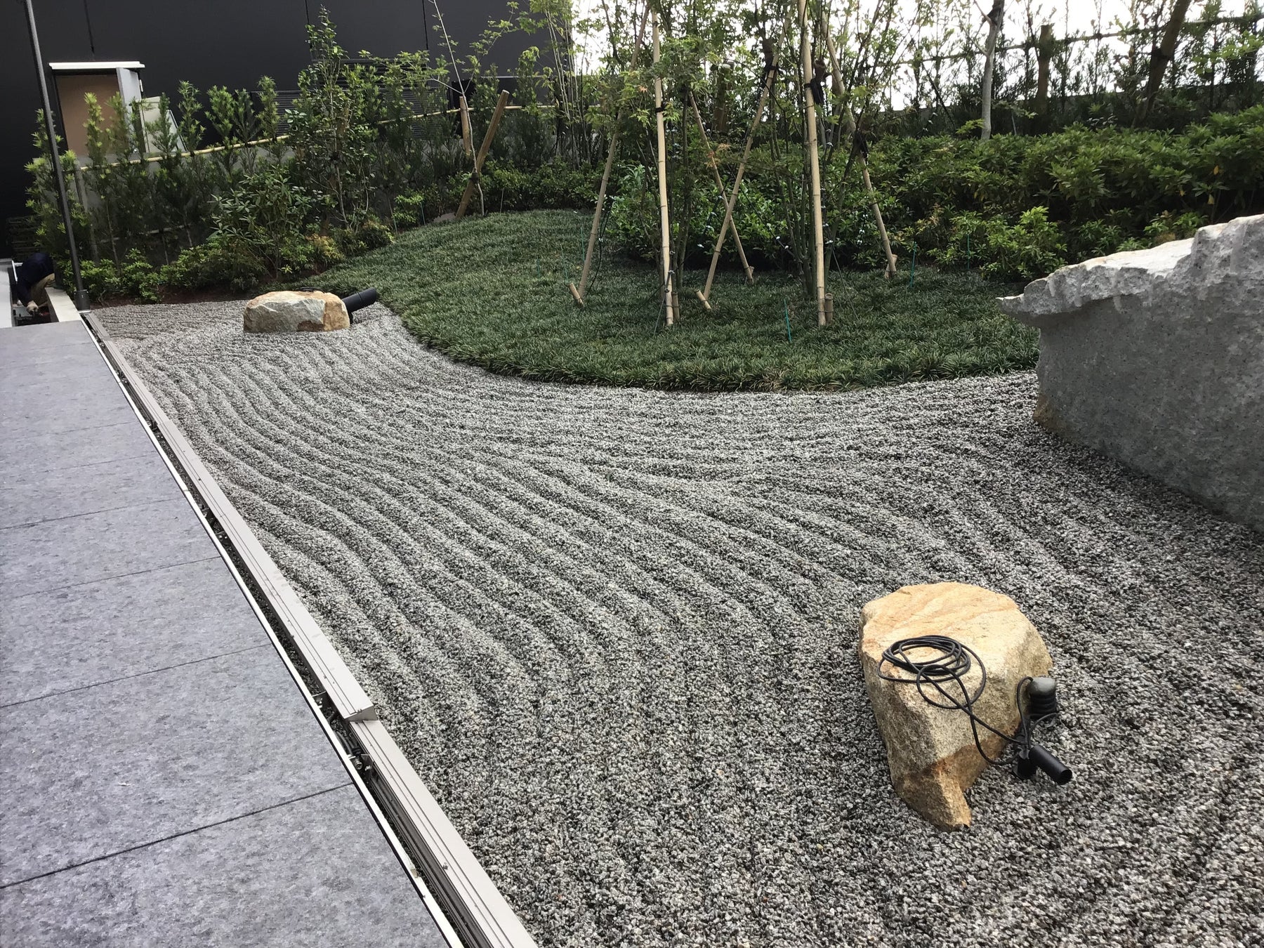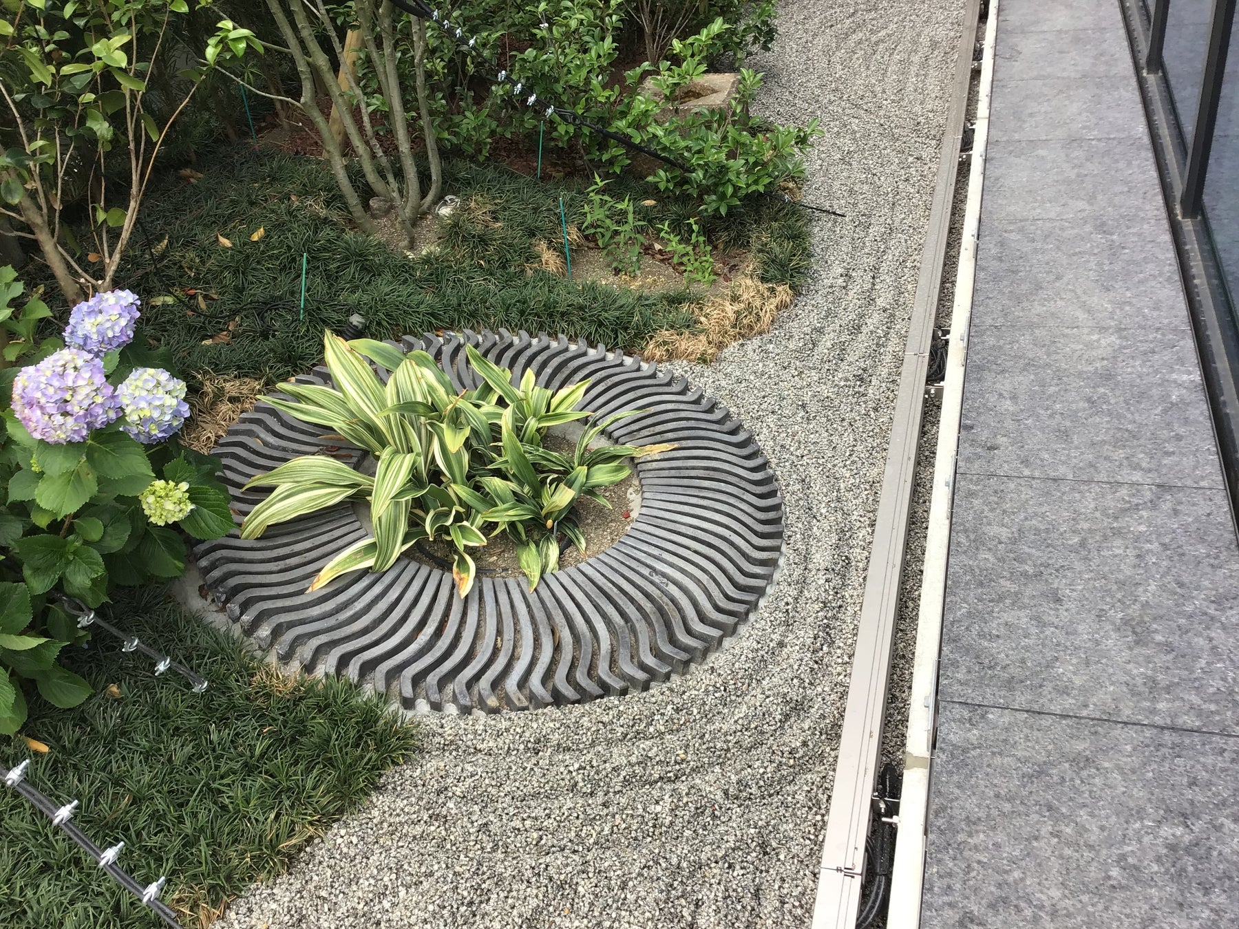 公共施設や商業施設の中庭:枯山水風の砂紋デザインを採用し、施設利用者に癒やしの空間を演出。