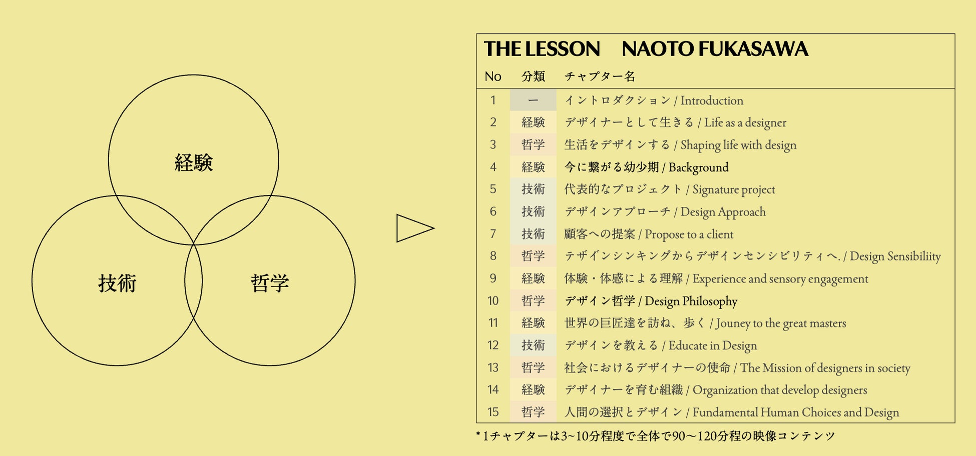 数々の名作を手掛けてきた中での経験・技術・哲学は勿論、世界をベースとしたデザイナーとしてのここまでの歩みや思考の変遷に触れる。「デザイナーとして生きる」ことの意味や「社会におけるデザイナーの使命」、「デザイン教育のあり方」など深澤直人さんの様々な方面での取り組みを余す事なく伝えるLESSONとなっている。