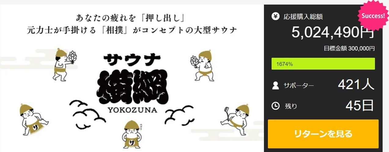 そんな中、「Makuake」にて『サウナ横綱』クラウドファンディングプロジェクトをスタート。応援購入金額は開始からわずか数分で目標金額として掲げた300,000円を突破し、数時間で1000%を超える3,500,000円に。
