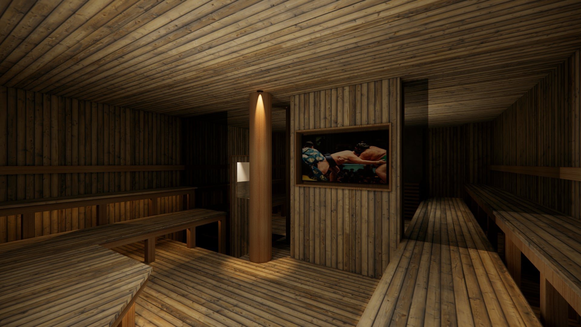 相撲の稽古場をイメージした『「サウナ横綱』のユニークな「稽古場サウナ」。中央には「鉄砲柱」を配置。