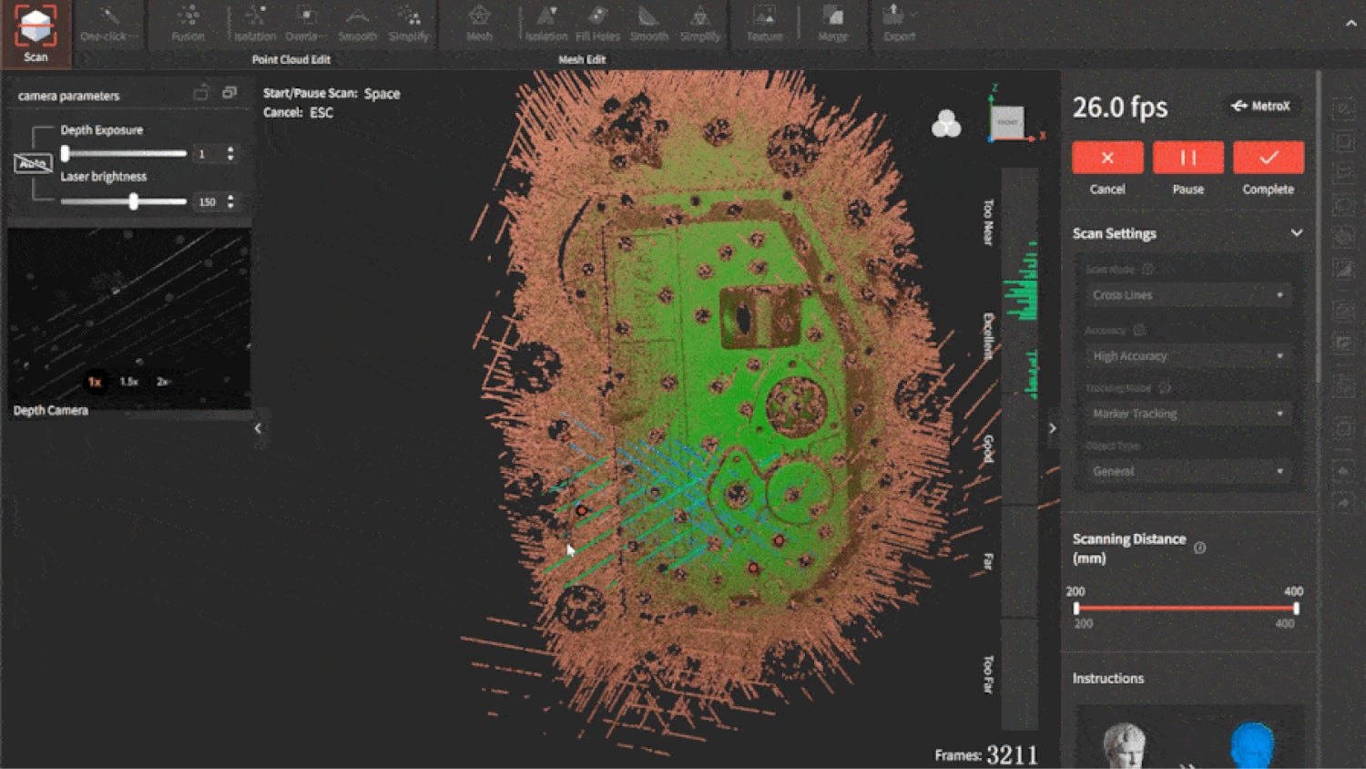 7本の平行ブルーレーザーラインスキャンモードで、細部、エッジ、複雑な表面を正確に捉え、3Dモデルの鮮明度を高めます。