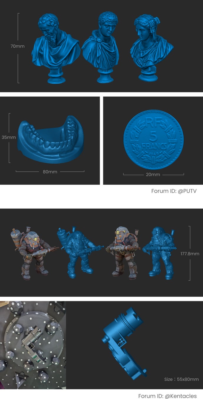0.01mm計測グレードの精度 | 14本青色レーザー交差ライン|7本ブルーレーザー平行ライン | 自動ターンテーブルスキャン|62本ブルーフルフィールド構造化光ライン | 無料ソフトウェア