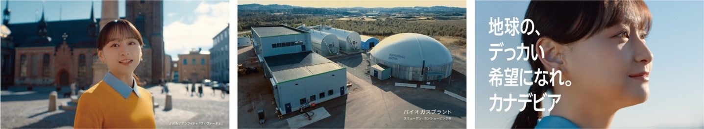 「CO₂をもっともっと減らすには?」「地球は、元に戻せるの?」という影山優佳さんの社会課題への探究心から始まる本CM。環境先進国であるスウェーデンを舞台に、家庭から出る生ごみからクリーンエネルギーであるバイオガス※を生成し、実際に街を走るバスの燃料としてバイオガスを活用する、脱炭素化への取り組みを紹介しています。
