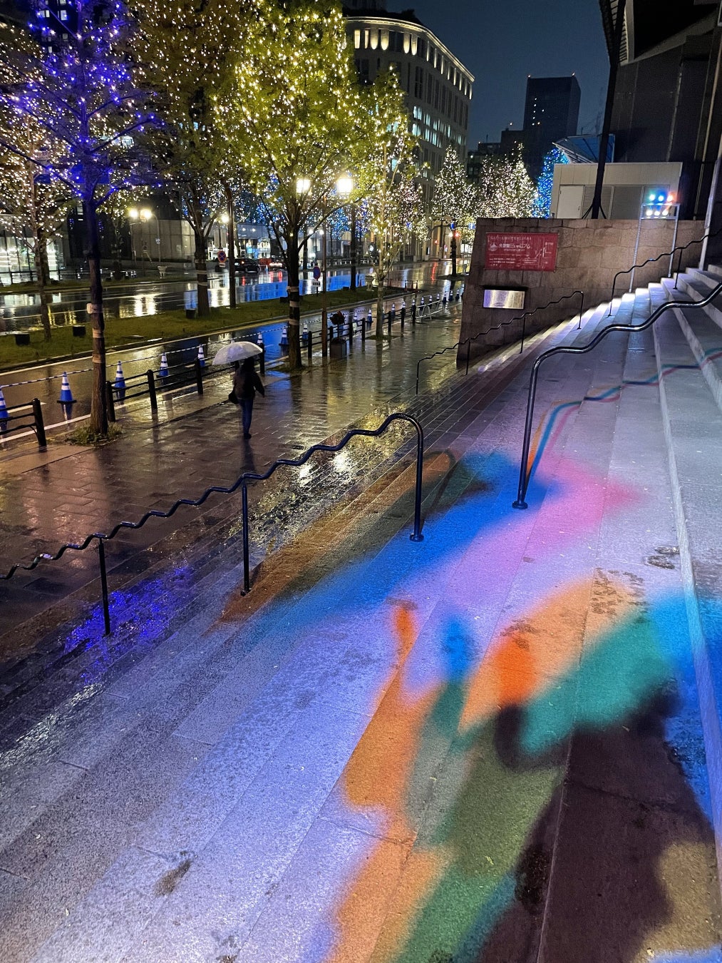 北御堂の山門前階段では影に色をつける光の演出を実施。階段を照らしている光には色がないのに、光の中に入ると影に色がつく不思議体験ができます。ぜひ思い思いのポーズで写真を撮ったり、動画を撮って遊んでください。