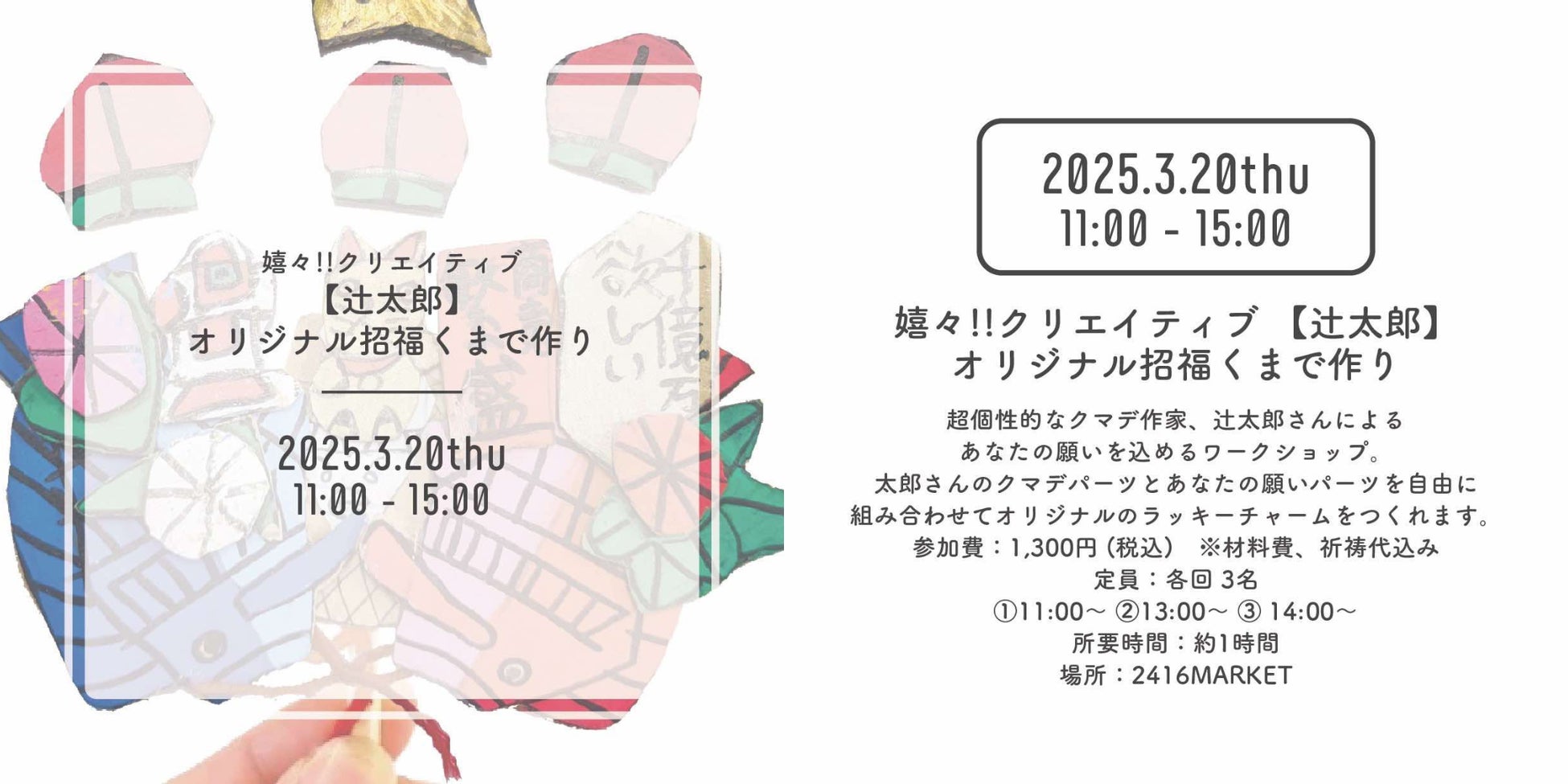 嬉々!!CREATIVEのアーティスト辻太郎さんと一緒にオリジナルの招福くまでを作りませんか?早口言葉のような口上販売と、ご利益のご報告を暗記し続ける超個性的なクマデ作家、辻太郎さんによるあなたの願いを込めるワークショップです。