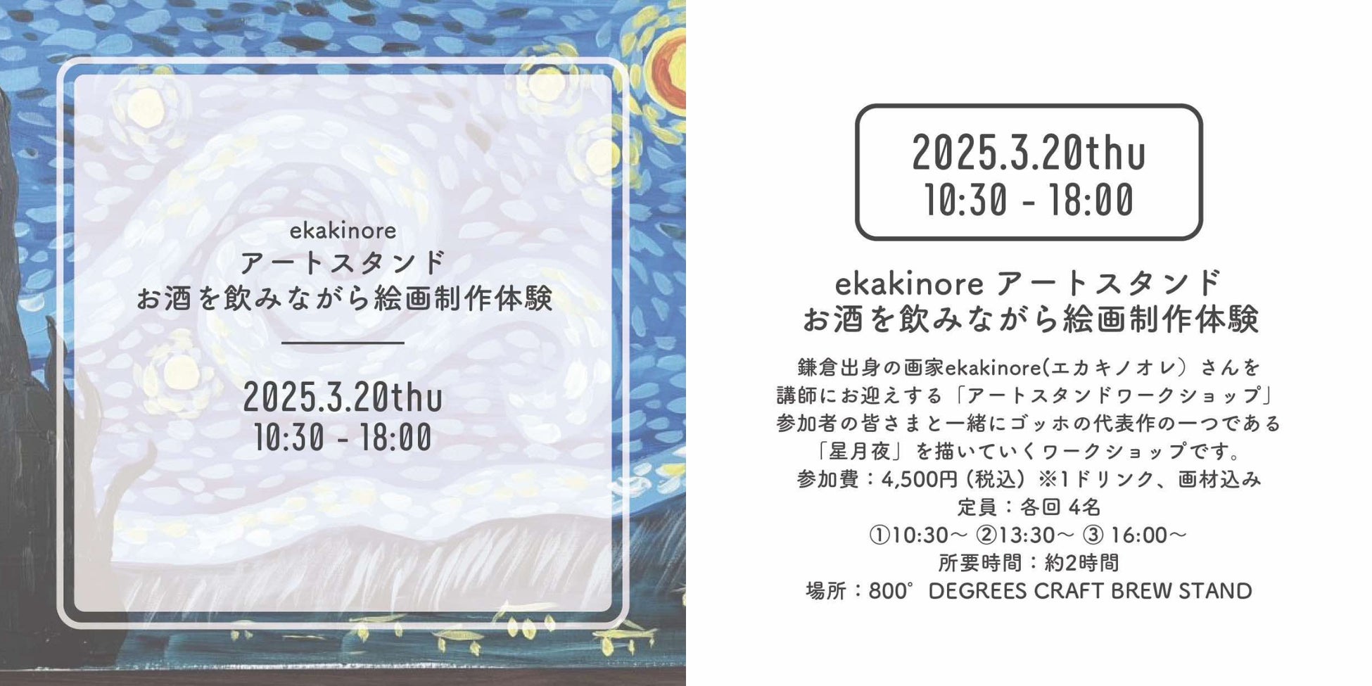 参加者の皆さまと一緒にゴッホの代表作の一つである「星月夜」を描いていきます。神奈川のクラフトビールを飲みながら、真っ白いキャンバスに思いっきり絵の具で絵を描いてみませんか?