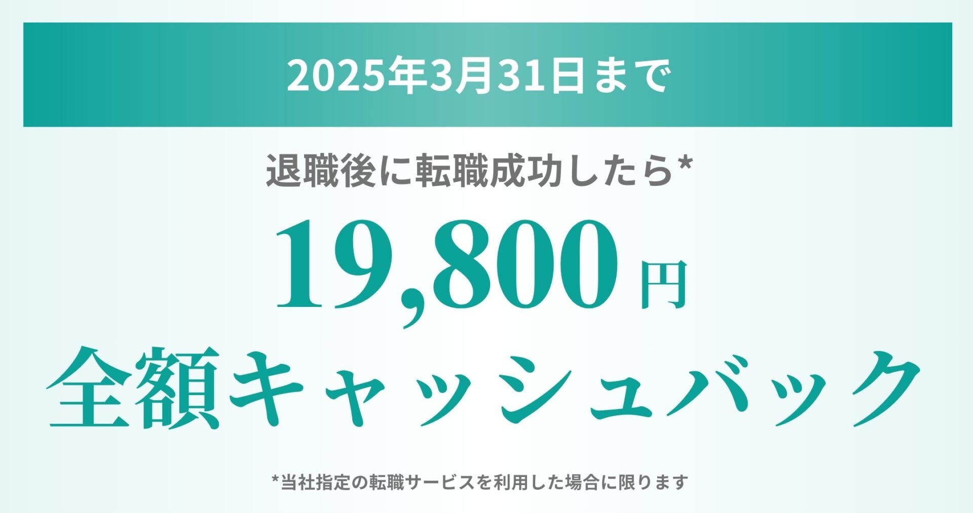 退職代行だいじょうぶを利用して退職し、さらに転職サポートを通じて転職に成功した方には、退職代行だいじょうぶのサービス利用料金19,800円を全額キャッシュバックするキャンペーンを実施します。