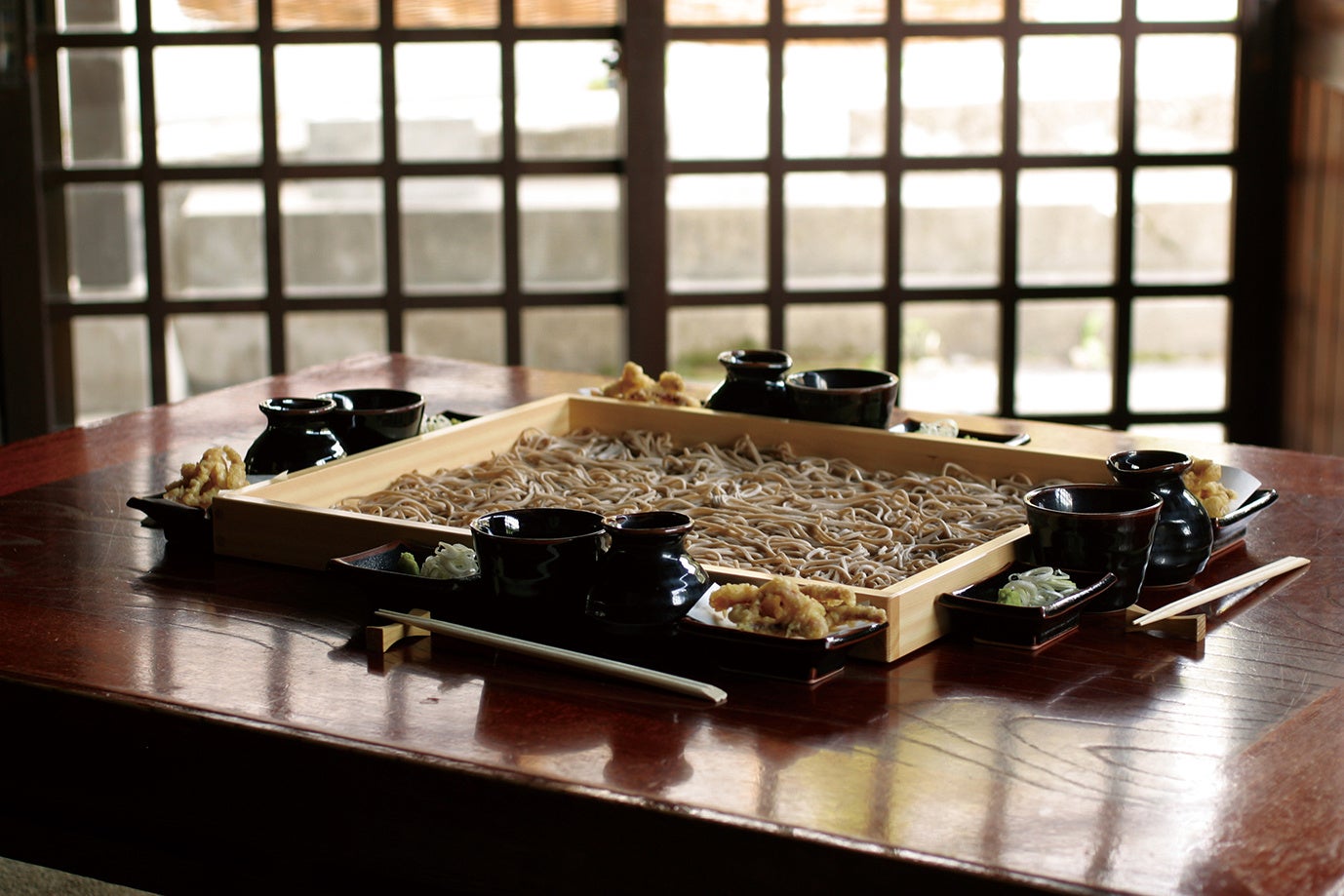 山形を代表する食し方で大きな長い板や木箱にそばを盛り付けます。2〜3名様分の量になります