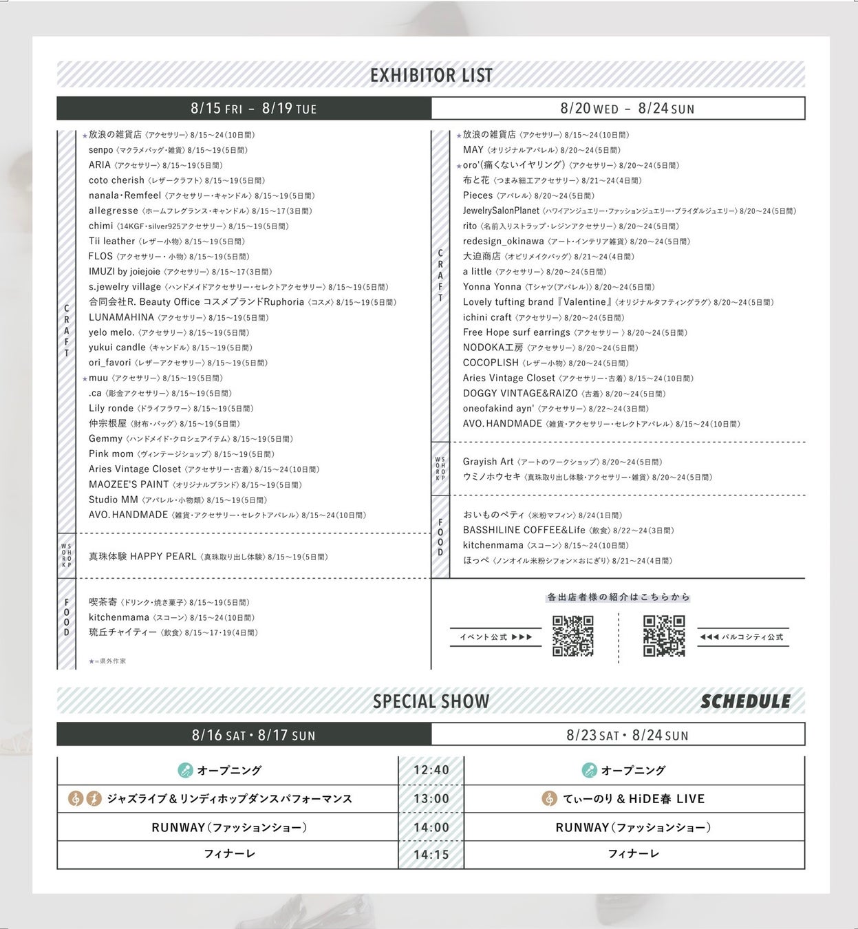 本イベントは、アクセサリー・雑貨・スイーツなど多彩なアイテムが並ぶ約60店舗のマルシェと、土日限定で沖縄の作家による作品やセレクトアイテムを15名のモデルが着用し披露するファッションショー、さらに人気アーティストによるライブステージが融合した、新感覚のエンターテインメントイベントです。