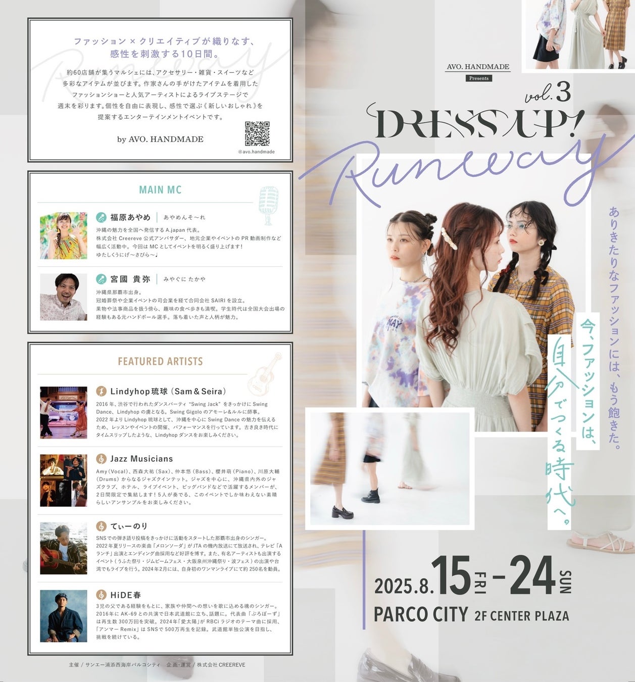 株式会社Creereve(代表:加野李那)は、沖縄のクリエイターとモデルが共演するファッション&クリエイティブイベント「DRESS UP! vol.3 ~ Runway ~」を、2025年8月15日(金)〜24日(日)の10日間、サンエー浦添西海岸 PARCO CITY 2階センタープラザにて開催いたします。