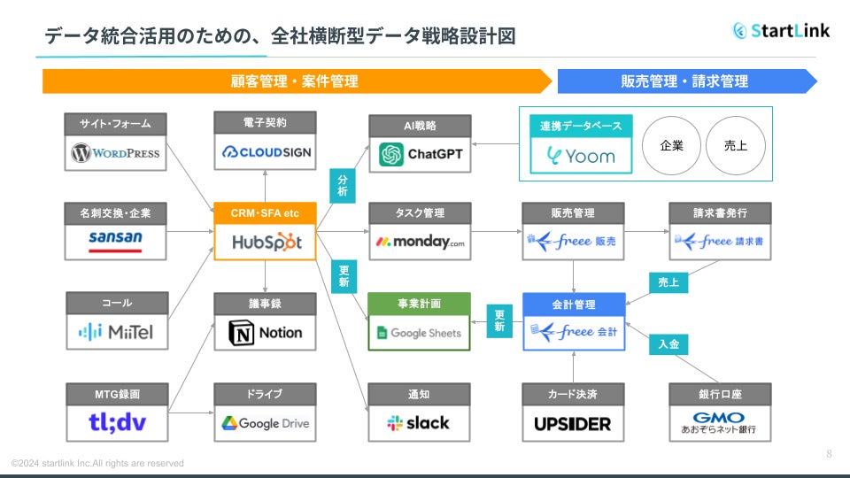 SaaSの活用が進み、複数のツールを横断して活用しないと事業推進が難しくなってきている近年では、経営基盤のDX化の重要性が年々高くなってきています。StartLink(スタートリンク)は、CRM・会計ツール・議事録ツール・チャットツールなど、複数のツールを横断的に連携し、統合的な経営基盤を確立するためのパッケージの提供を開始します。