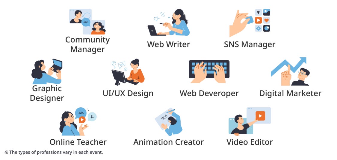 1か月間で10職種のリモートワークに適した職種を体験(テイスティング)を通じて、自身が「夢中になれること」を発見する機会を提供します。
