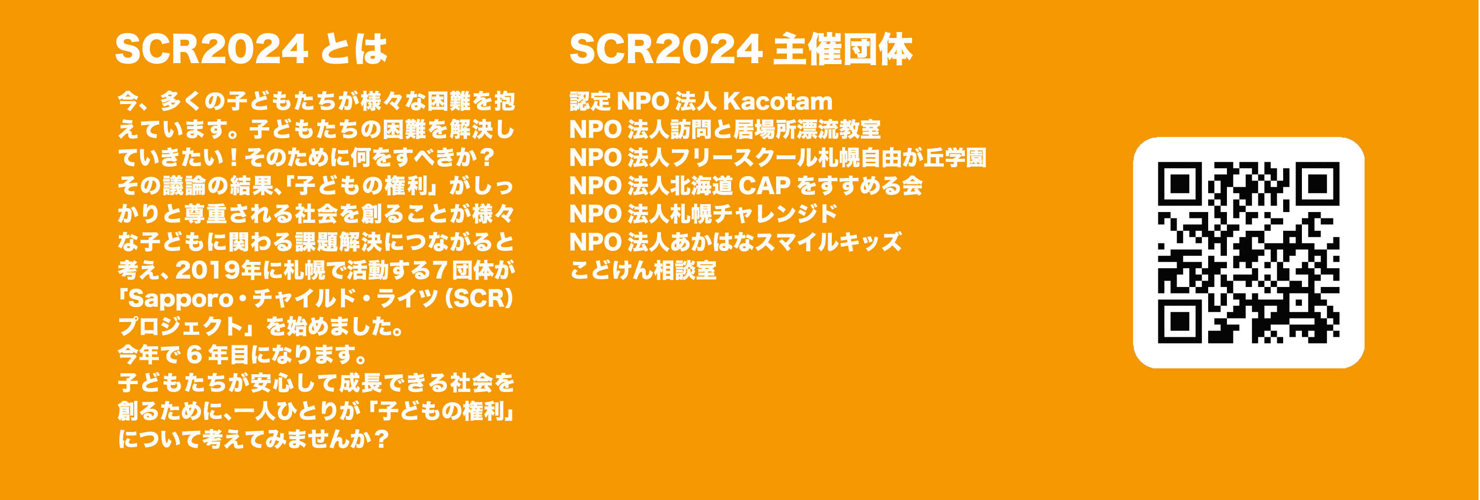 NPO法人札幌チャレンジドは、札幌市内で子どもに関わる活動を行っている7団体が連携し、「子どもの権利」のことを広く世の中に伝え、考えるキッカケとする「Sapporo・チャイルド・ライツプロジェクト(SCR2024プロジェクト)」を「児童虐待防止推進月間」の11月に実施します。