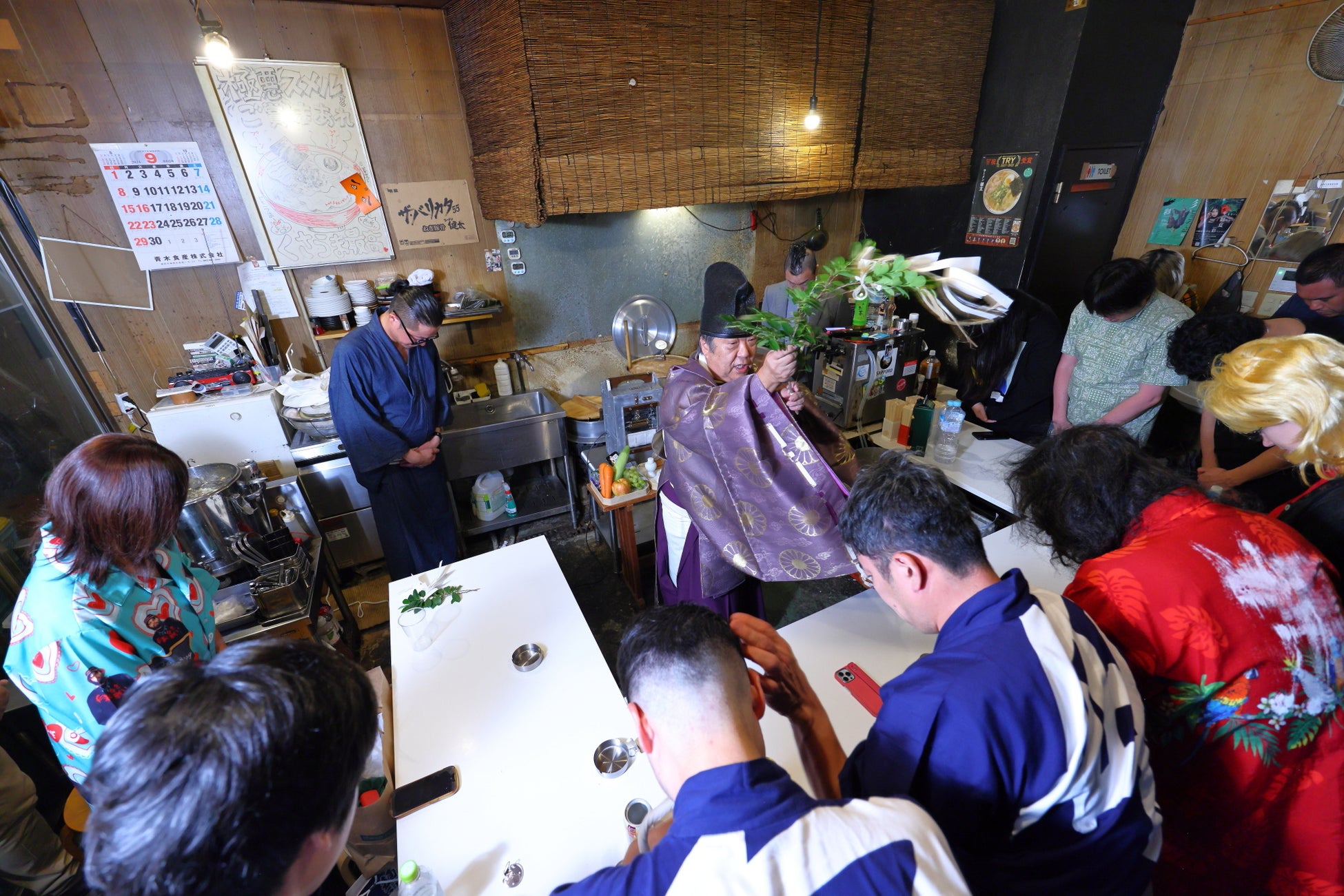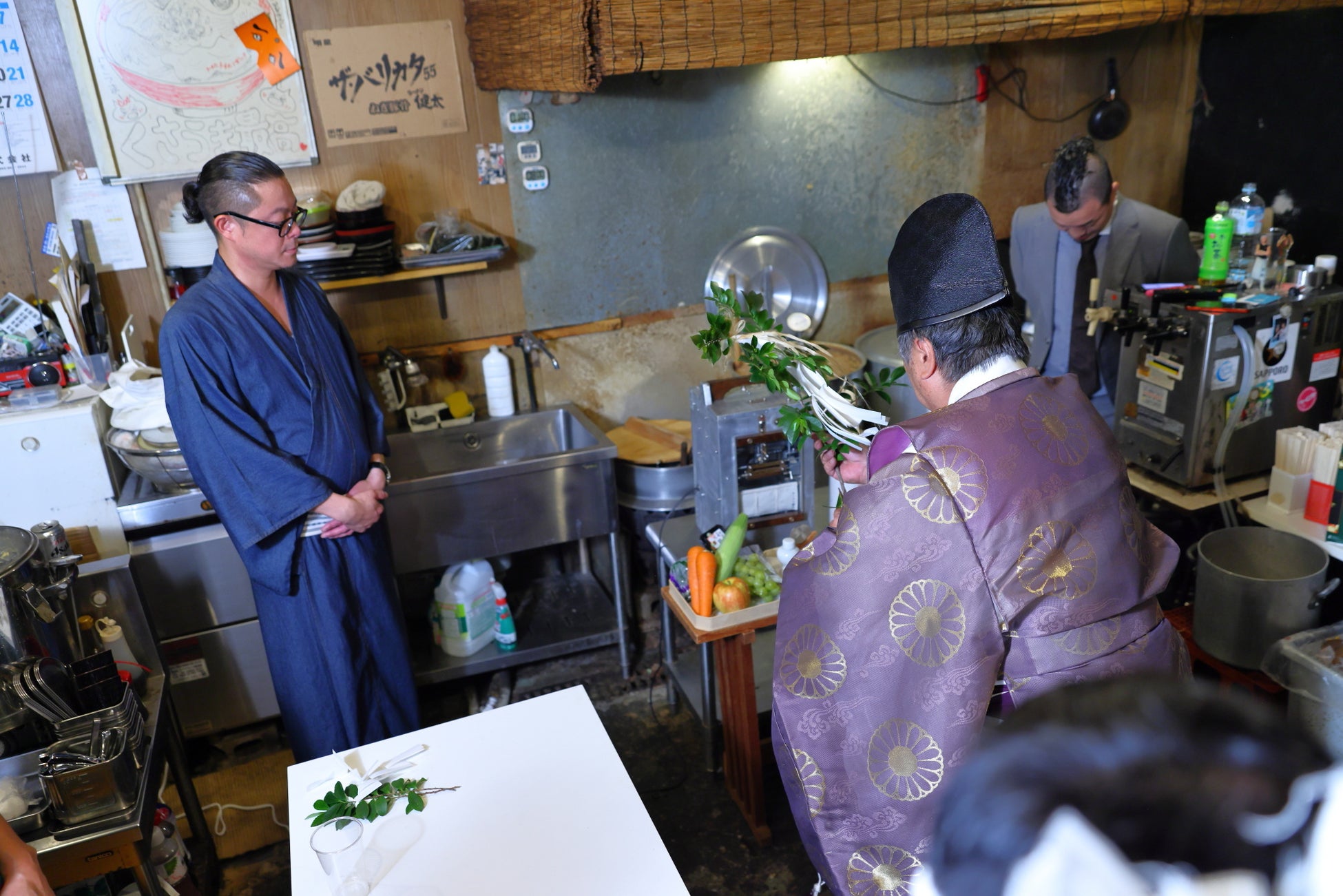 中野区大和町に境内を構える大和町八幡神社の宮司様による修祓式では、「ラーメン健太」の繁盛と、来場者の方々のご発展を祈願いただきました。宮司様からは「このあづま通りをさらに賑やかにし、アジアを超え、世界を目指して頑張ってほしい」と祝辞もいただいております。
