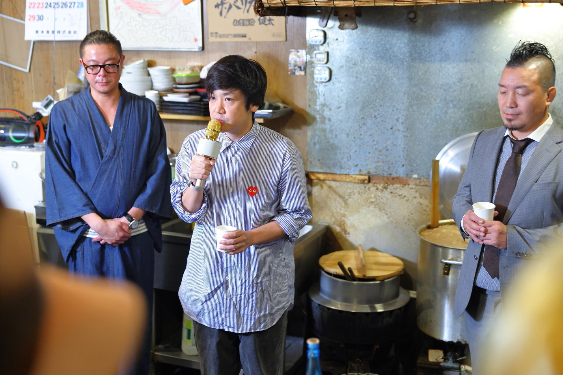 「本日はこのようなおめでたい場にお招きいただき、誠にありがとうございます。正装で参りました。現在私が代表を務める『ラーメン凪』は、海外に55店舗を展開しており、私自身海外に滞在していることも多いのですが、日本に帰った際に必ず立ち寄るラーメン店の一つが、ここ『ラーメン健太』です。私は『ラーメン健太』も、健太さんも、めちゃめちゃ好きです。『ラーメン健太』のような店が日本に増えることを祈っております」