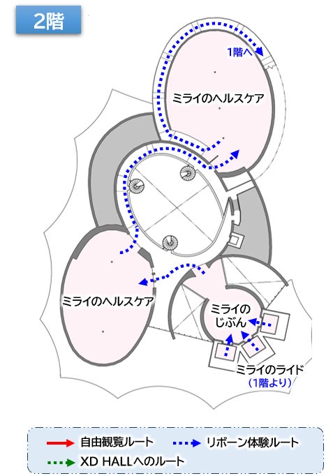 カラダ測定ポッドで来館者の健康データを測定後、ミライのライドで2階へ。25年後のじぶん(アバター)に出会う。
