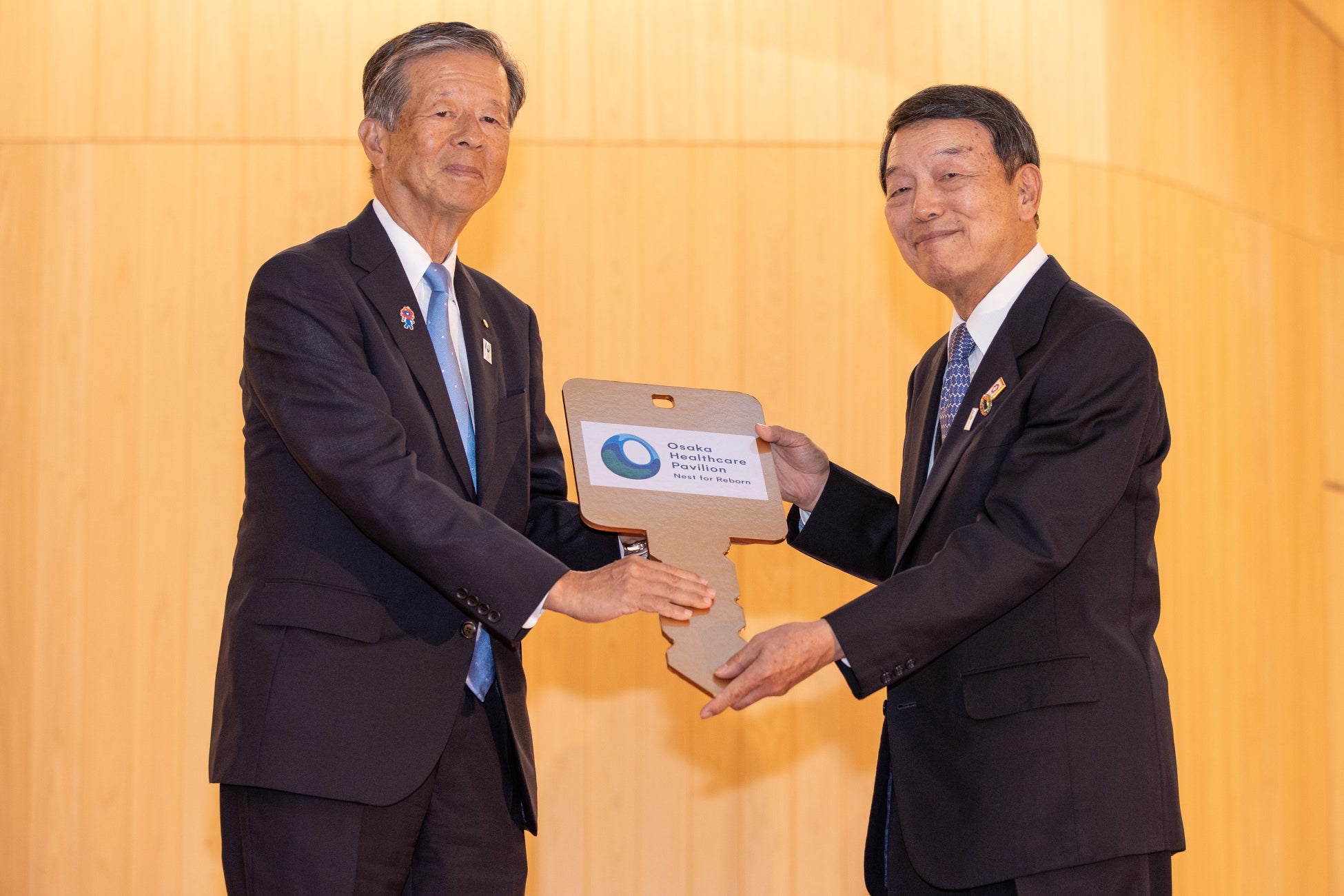 引き渡しセレモニーでは、大阪ヘルスケアパビリオンの建設を担当した株式会社竹中工務店より、公益社団法人2025年日本国際博覧会大阪パビリオン 副代表理事 西澤良記に向け、パビリオンの鍵を模したプレートの贈呈が行われました。副代表理事 西澤良記からは「様々な課題を克服して、当初の予定通り無事工事が完了し、本日を迎えることができました。いよいよ11月から展示工事へ移行します。多くの来館者をお迎えできるように、魅力ある展示コンテンツを協賛企業や協力機関をはじめとする皆さまと一緒に創っていきたいと思います。」と開館に向けた意気込みを述べました。