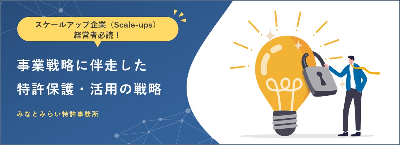 弁理士法人みなとみらい特許事務所(本社:神奈川県横浜市、代表:辻田朋子、以下「みなとみらい特許事務所」)では、スケールアップ企業の経営者様・事業拡大を始めるスタートアップ企業の経営者様を対象とした無料ダウンロード資料「スケールアップ企業 経営者必読!事業戦略に伴走した特許保護・活用の戦略」を公開しました。