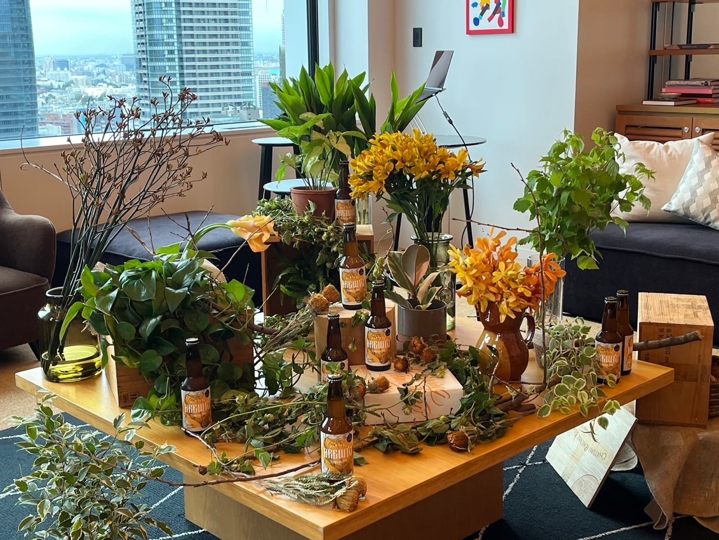 会場中央には、木原が山口から持ち帰ったばかりのフレッシュホップをアレンジメントとして飾り、トロピカルで芳醇な香り漂う中、BREWTO Tropical XPAをお楽しみいただきました。