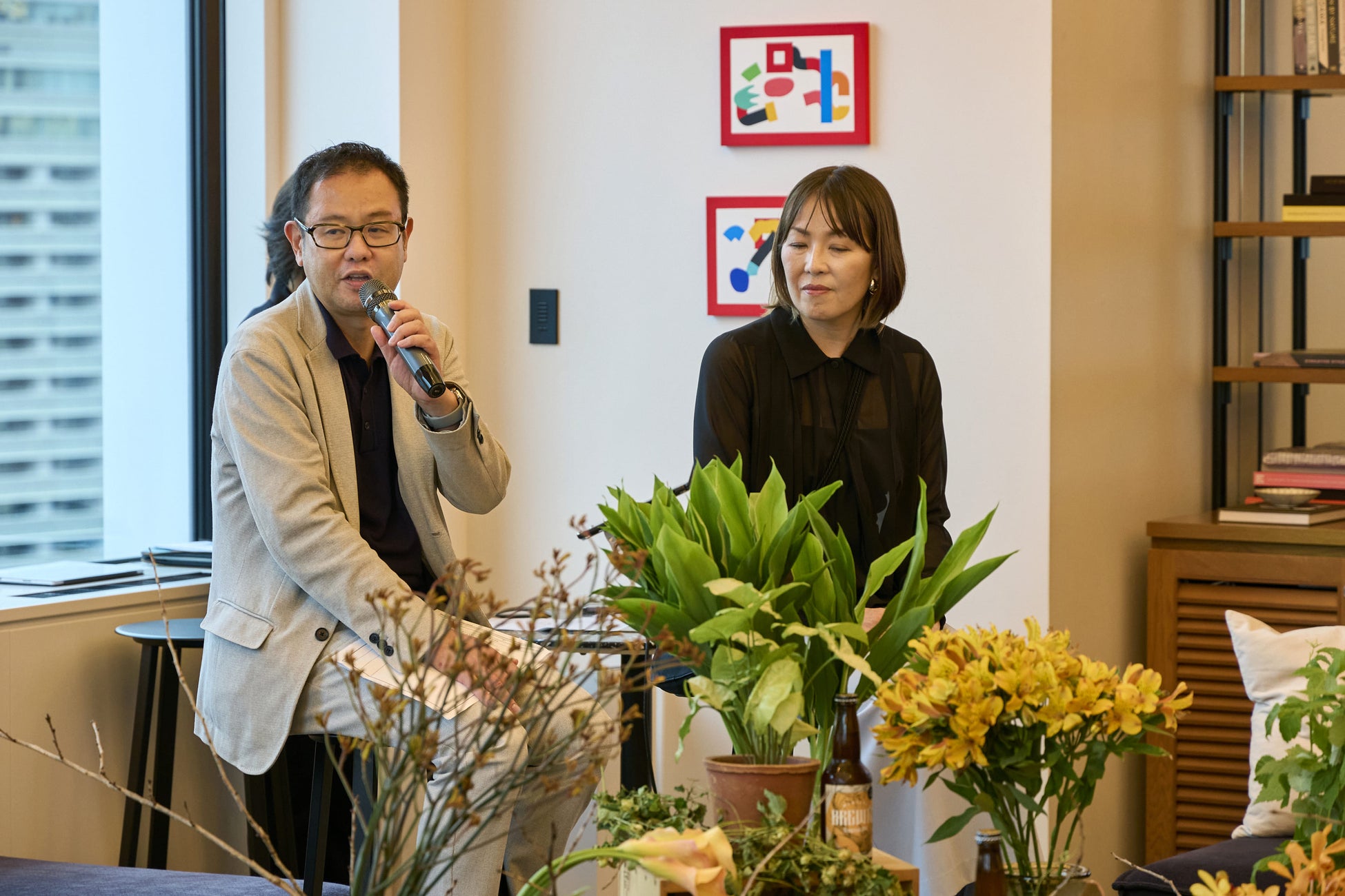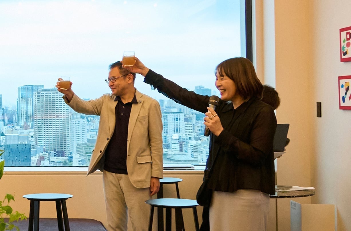 発表会では、冒頭、代表取締役木原かえよりブランド立ち上げに至る思いや、開発の経緯などをご説明、続いて開発を伴奏した創業27年のクラフトビールメーカー、山口地ビール株式会社中川弘文社長(リモート参加)有限会社小林商店小林義明社長と木原による対談を実施、終了後はご来場の方々とBREWTO Tropical XPAで乾杯。和やかな雰囲気の歓談となりました。