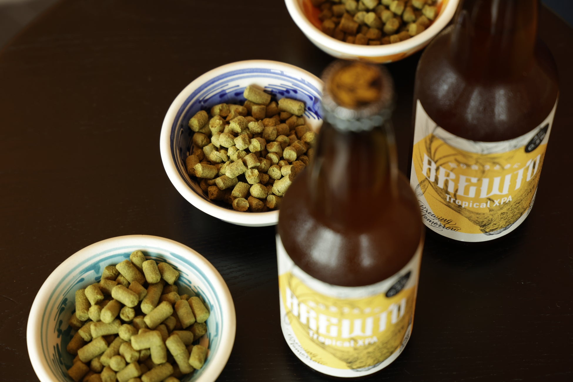 また、BREWTO Tropical XPAで原料として使用している3種のホップは小皿に入れて飾り、ビールそのもののトロピカルな香りを体験していただきました。