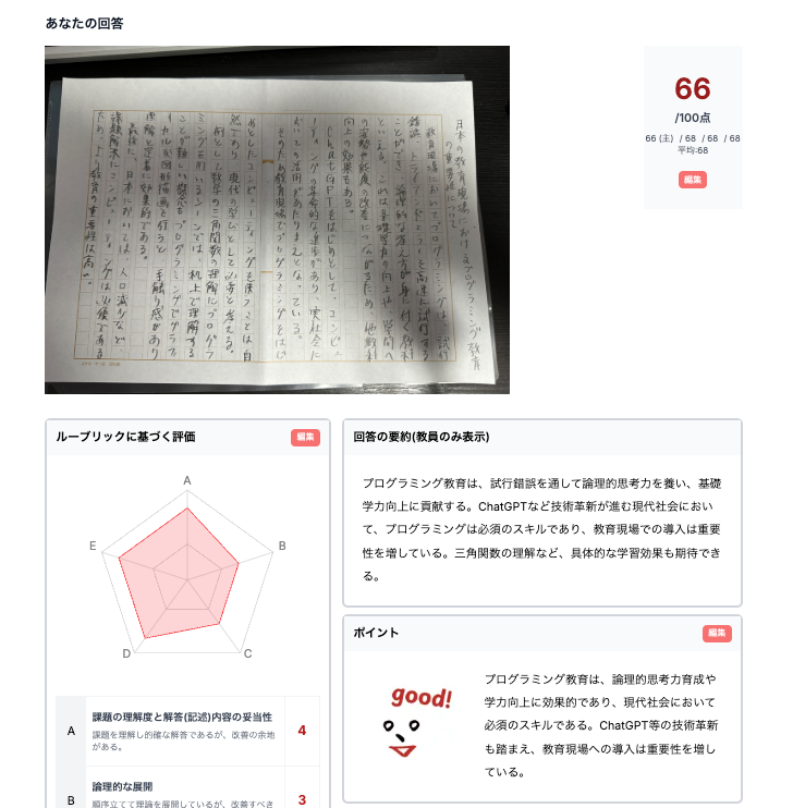 従来の入力型答案に加え、手書きの答案もAIが自動で読み取り、添削・採点を行います。学校やテストの運用方法、さらには先生の採点スタイルに合わせて柔軟に活用でき、幅広い教育現場に対応します。