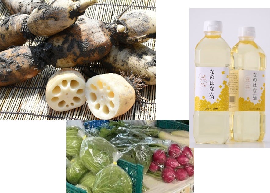 全国でも有数の生産量を誇る「れんこん」や各種新鮮野菜、西尾抹茶、米粉ミニクレープ、醤油味付けメンマ、味のり、はちみつ、なのはな油、守口漬など、魅力的な商品が盛りだくさん!