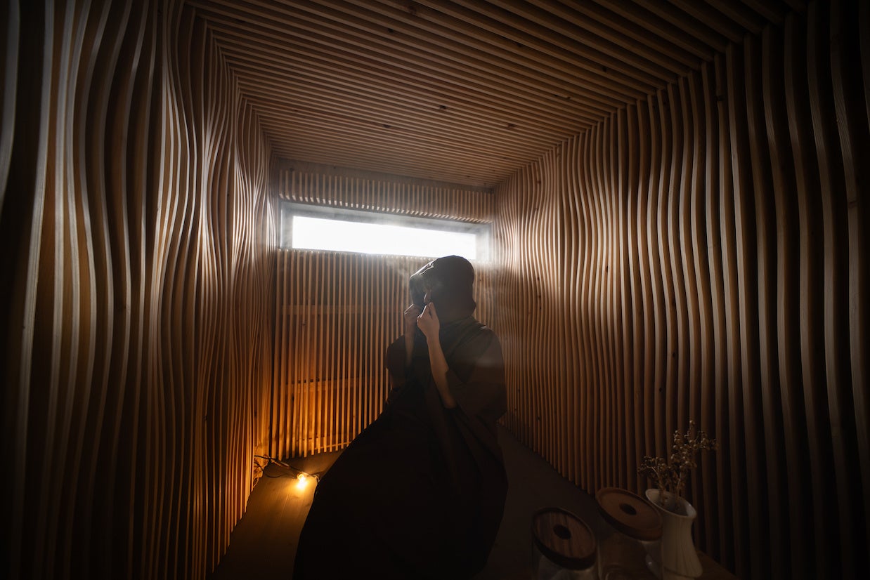 デジタルCADで精巧にカットされたヒノキが生み出す、温もりとアートが融合した特別な空間。