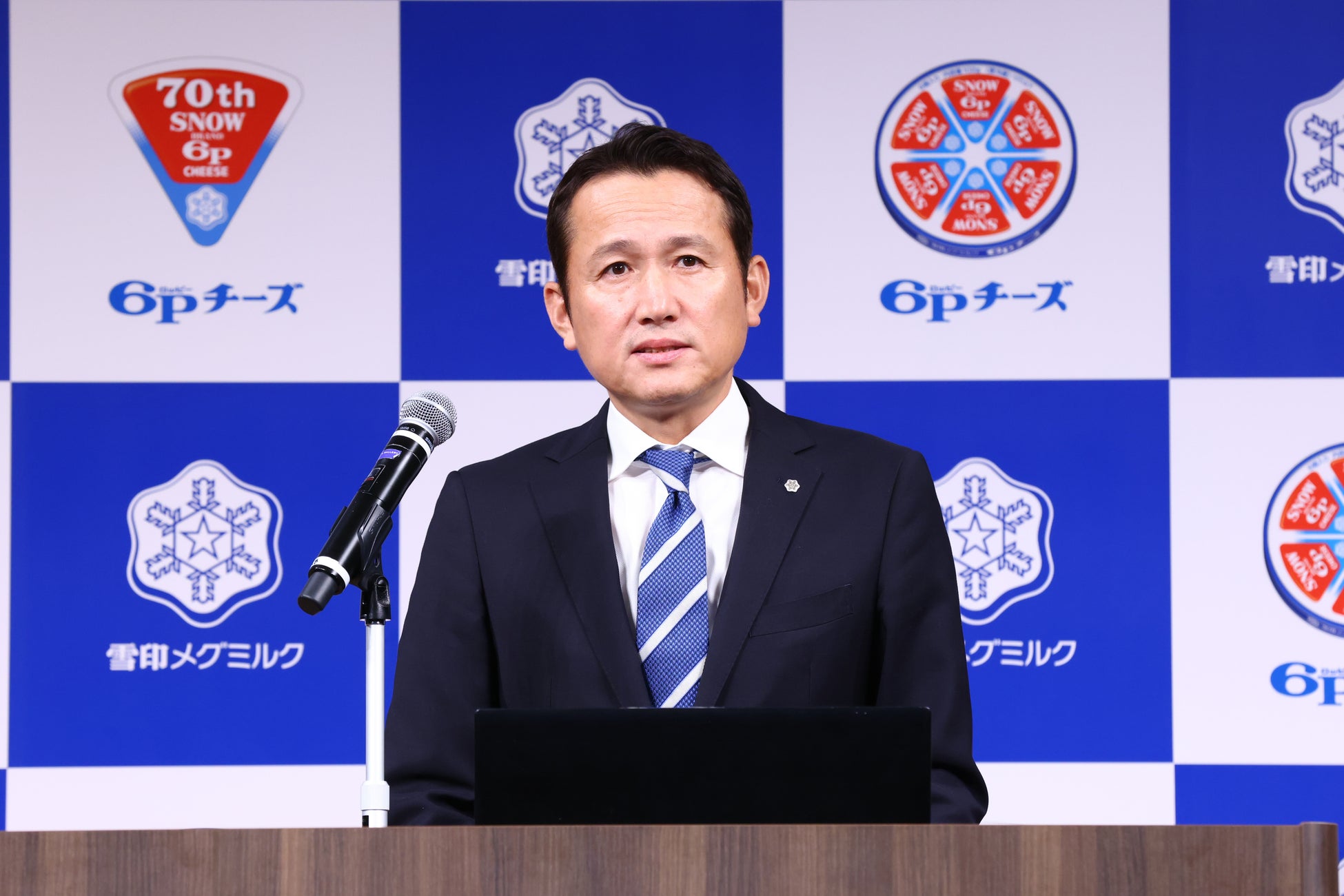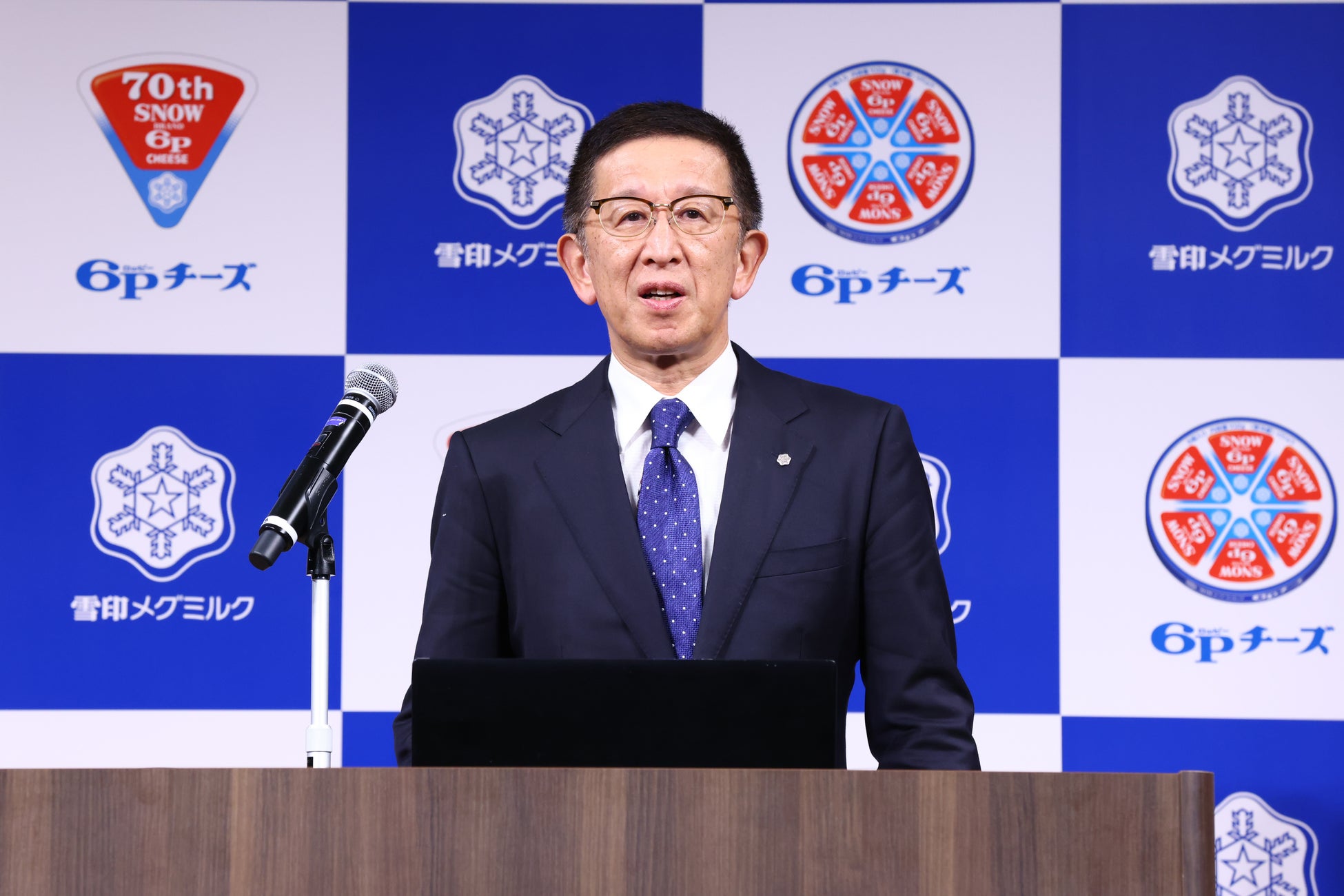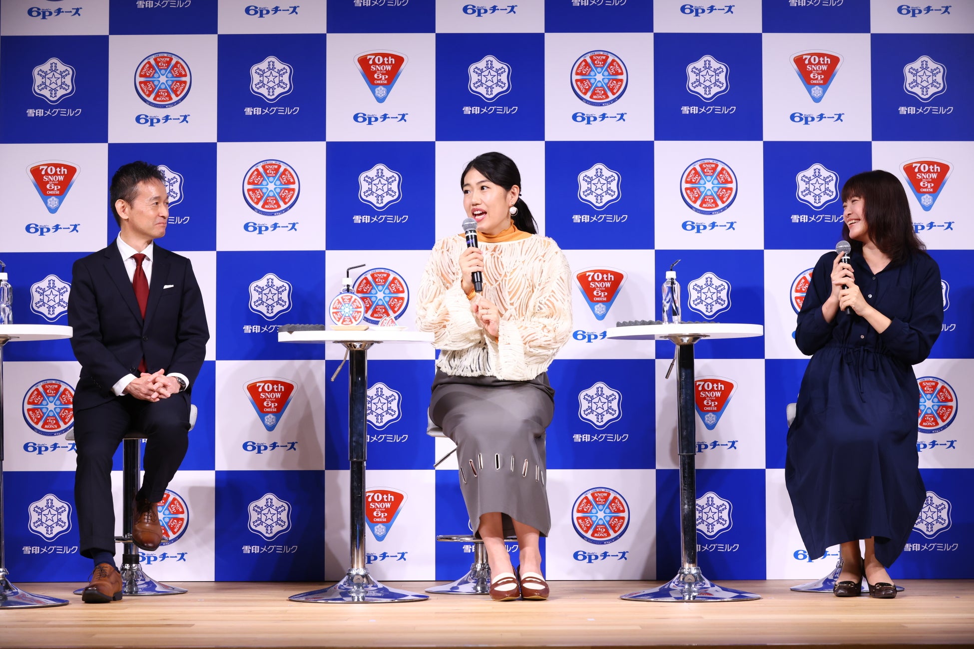 本イベントでは、はじめに雪印メグミルク株式会社 取締役常務執行役員 稲葉聡氏 と 乳食品事業部長 加藤光一郎氏が登壇し、今年70周年をむかえる「6Pチーズ」の歴史や中期経営計画について発表しました。