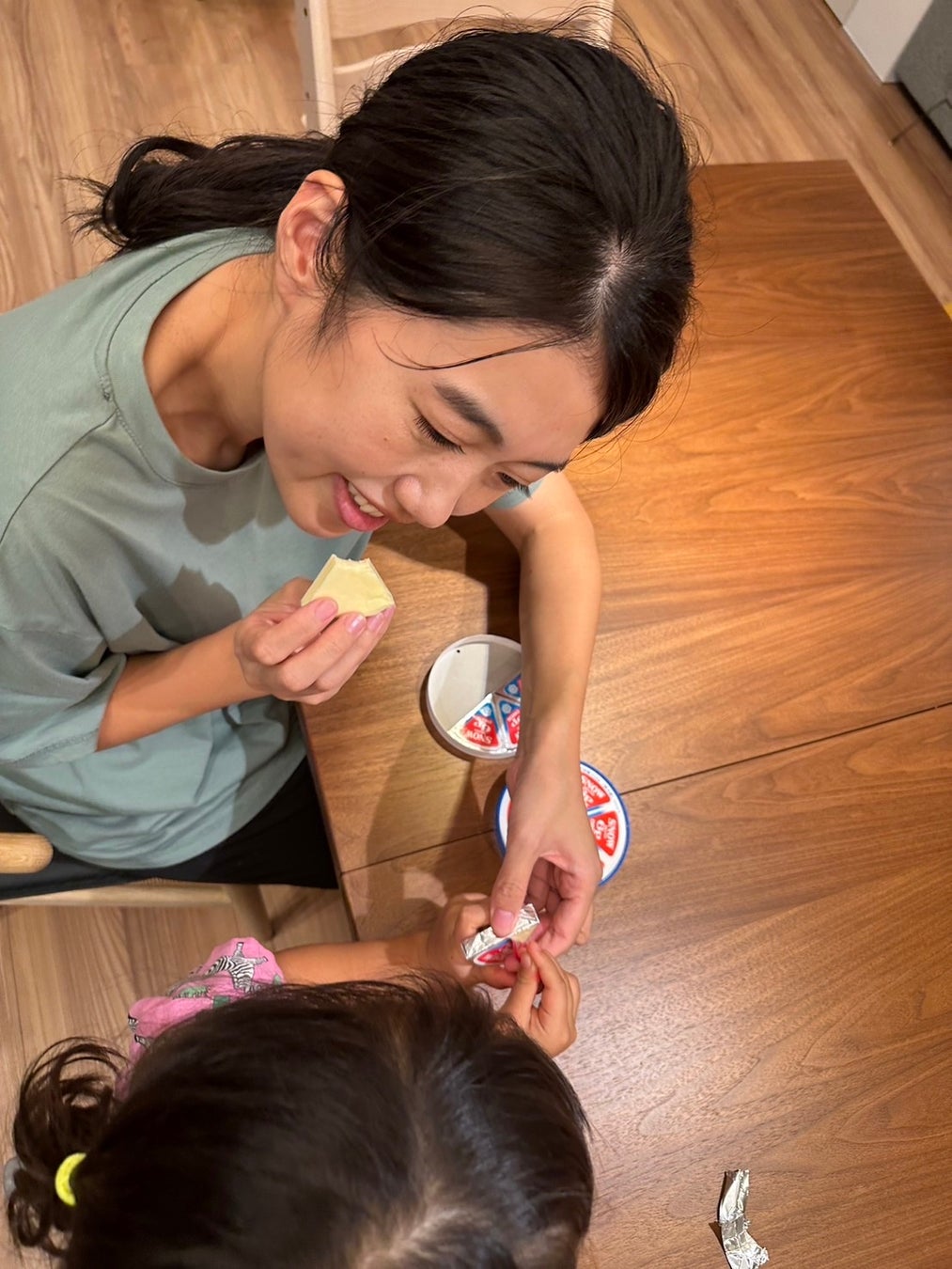 「4歳の長女は1人で『6Pチーズ』をむけるのですが、3歳の次女がむけない姿をみると手伝ってあげることも。『6Pチーズ』は個包装になっているので、お手伝いにもぴったりで、長女はよく配ってくれます!自分だけのチーズという点も嬉しくて、3姉妹も楽しんでいて、今は1歳の子もバクバク食べています。食べた『6Pチーズ』の空き箱は捨てずに積み木のようにとってあります!」と嬉しそうに語っていました。