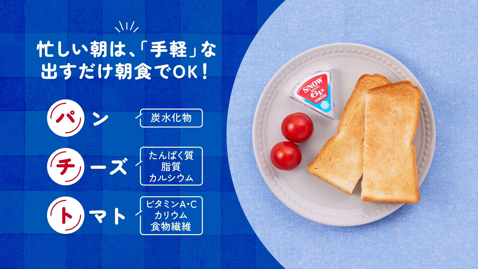 忙しい朝でも「手軽」に出せる、パン・チーズ・トマトの組み合わせ「パチト」は栄養バランスも整ったメニュー。食事では3大栄養素をバランスよくとることが重要で、手軽にたんぱく質をとれるチーズは朝食におすすめ。さらに、朝食には体内時計を整える役割もあるため、時間栄養学の観点からも毎日しっかり朝食をとることが重要です。