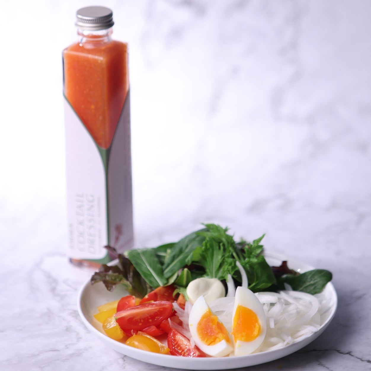 いつものサラダも「エマ・カクテルドレッシング 金時にんじん」を加えることで彩り豊かになります。ベビーリーフ、ミニトマト、スライスオニオン、ゆで卵を盛り付け、カラフルな色彩とともにお召し上がりください。