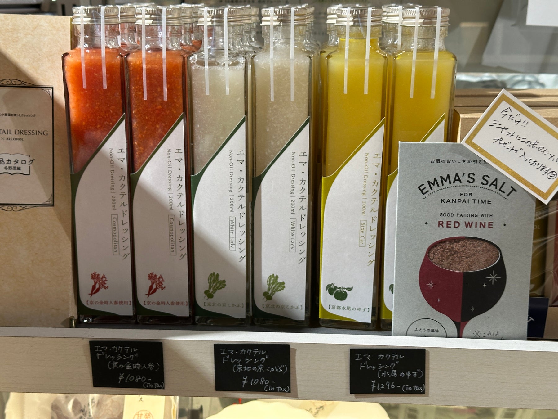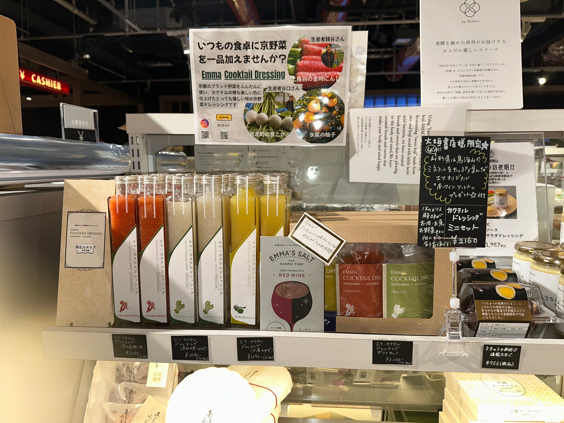 同店のコンセプトは、国内外の方々に京都の旬を発信する、というもの。そこに、京都産のブランド野菜を使ったエマ・カクテルドレッシングが合致したことから、今回の販売となりました。