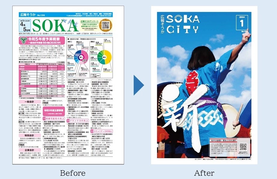広報そうかは、「読みたくなる広報紙」を目指して、2024年1月にリニューアルしました。それまでは青黒二色刷り(表紙と最終面を除く)だったため、写真が白黒で伝わりづらいことや文字が多くて見づらいとう意見が多く、読んでくださる市民の方が少なくなってきているという課題がありました。そこで、表紙のデザインやロゴを一新、情報を整理し、カテゴリーごとに情報をまとめるなどレイアウトの工夫を行い、市民の方が読みやすく、情報が伝わりやすい広報紙を目指しました。また、発行回数を月2回から1回に見直すことで、配布料や印刷コストの削減を図り、全ページフルカラー化した上で経費の削減も同時に実現しました。